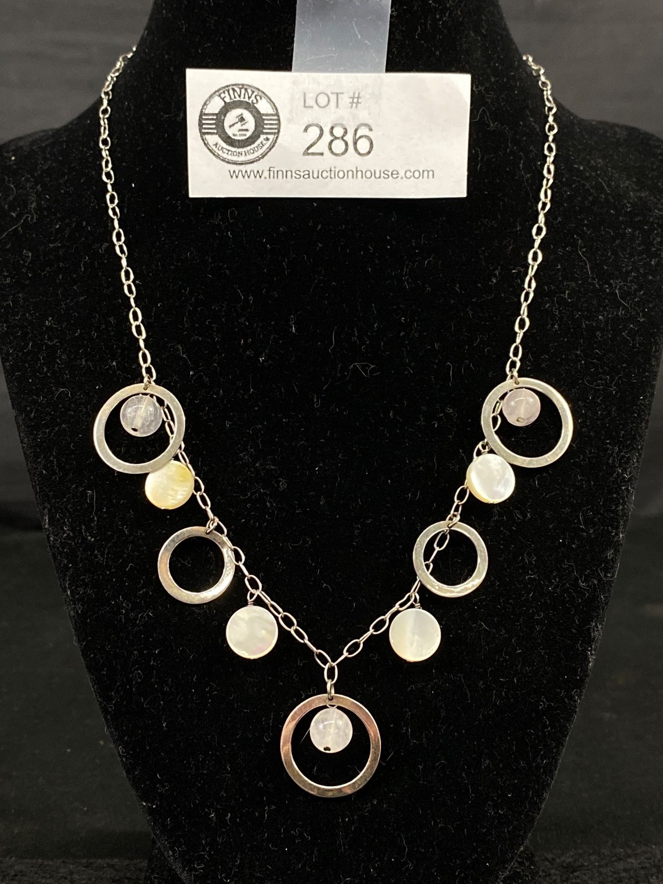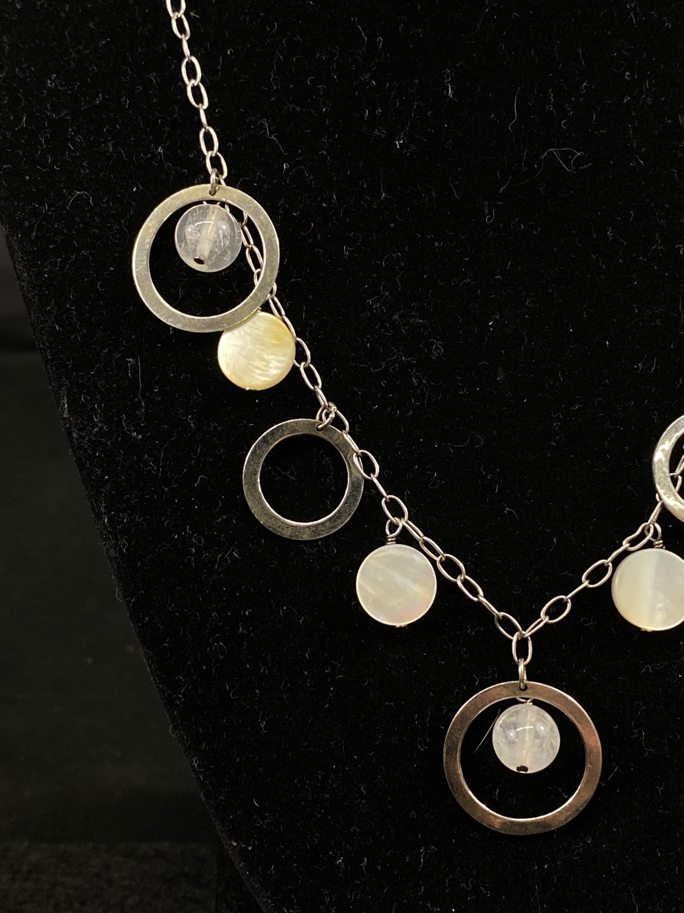 .925 Sterling Silver w/Dangling Mother of Pearl, Glass Beads & Rings Necklace