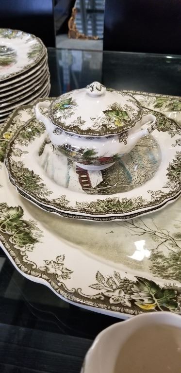 93 PIECES JOHNSON BROS "THE FRIENDLY VILLAGE" MADE IN ENGLAND CHINA SET - 8PC 10 PERSON SETTING MISSING 2 SIDE PLATES, 2 PLATTERS, SERVING DISHES AND PLATES, BUTTR PLATE, GRAVY BOAT AND PLATE, AND CREAMER