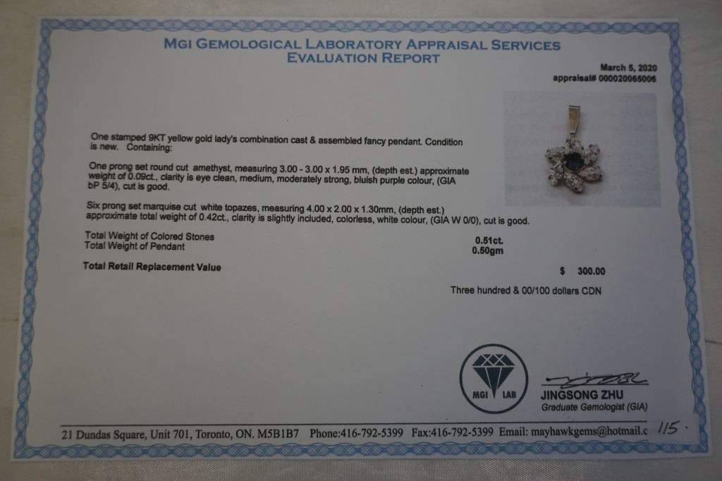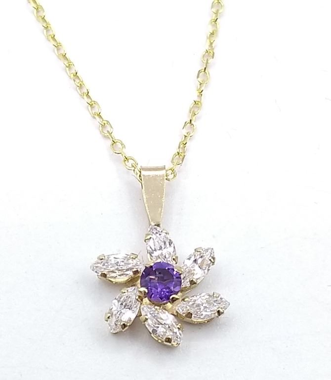 9KT YELLOW GOLD 3MM GENUINE AMETHYST AND CZ PENDANT W/ YELLOW GOLD PLATED STERLING CHAIN W/ APPRAISA