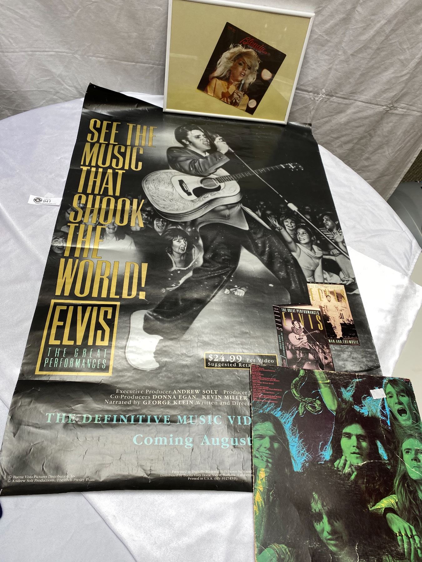 A Elvis Presley Poster + A Framed Blondie Poster + A Record Calender Label
