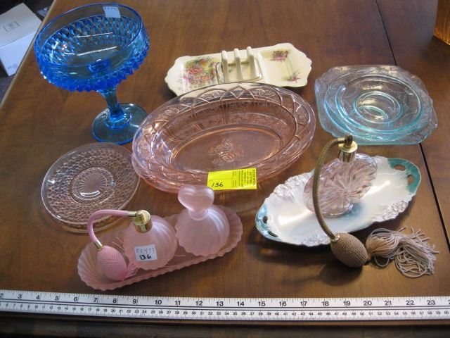 A LOT OF ASSORTED GLASSWARE, PERFUME AT0MIZER ETC.