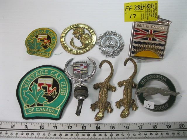 A LOT OF MISC VINTAGE CAR CLUB BADGES, CAR EMBLEMS ETC.