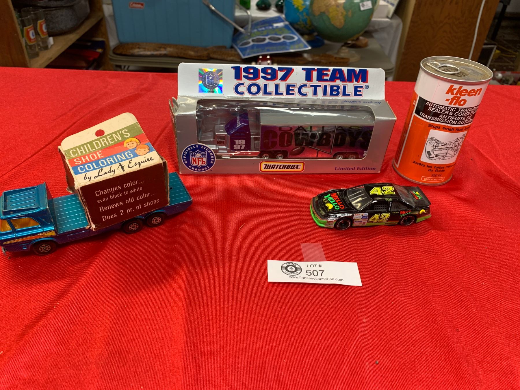 A Matchbox Dallas Cowboys Semi Truck and Trailer Race Car. Vintage Shoe Xolouring Book and a 1974 Lesney Tractor Transporter