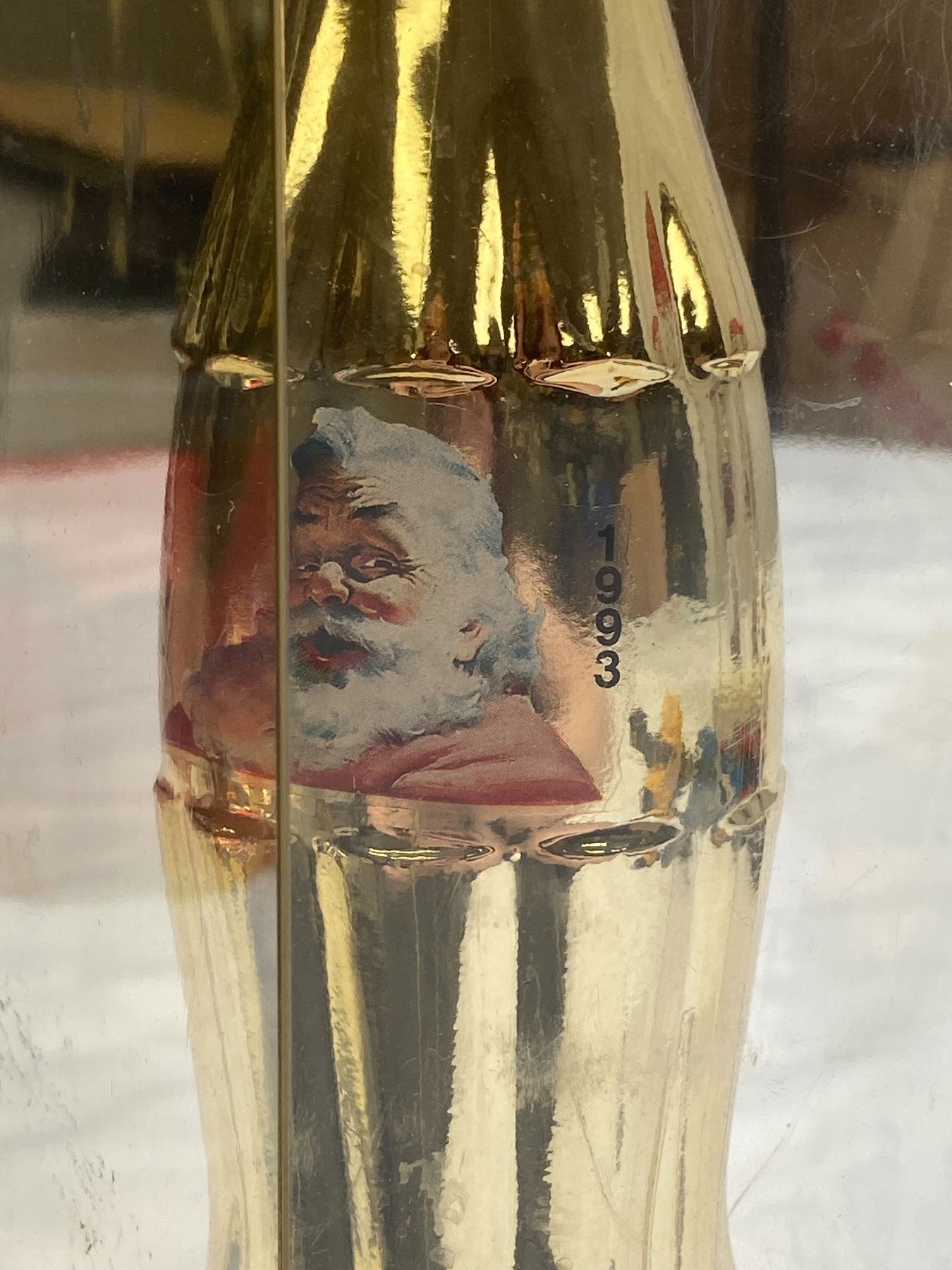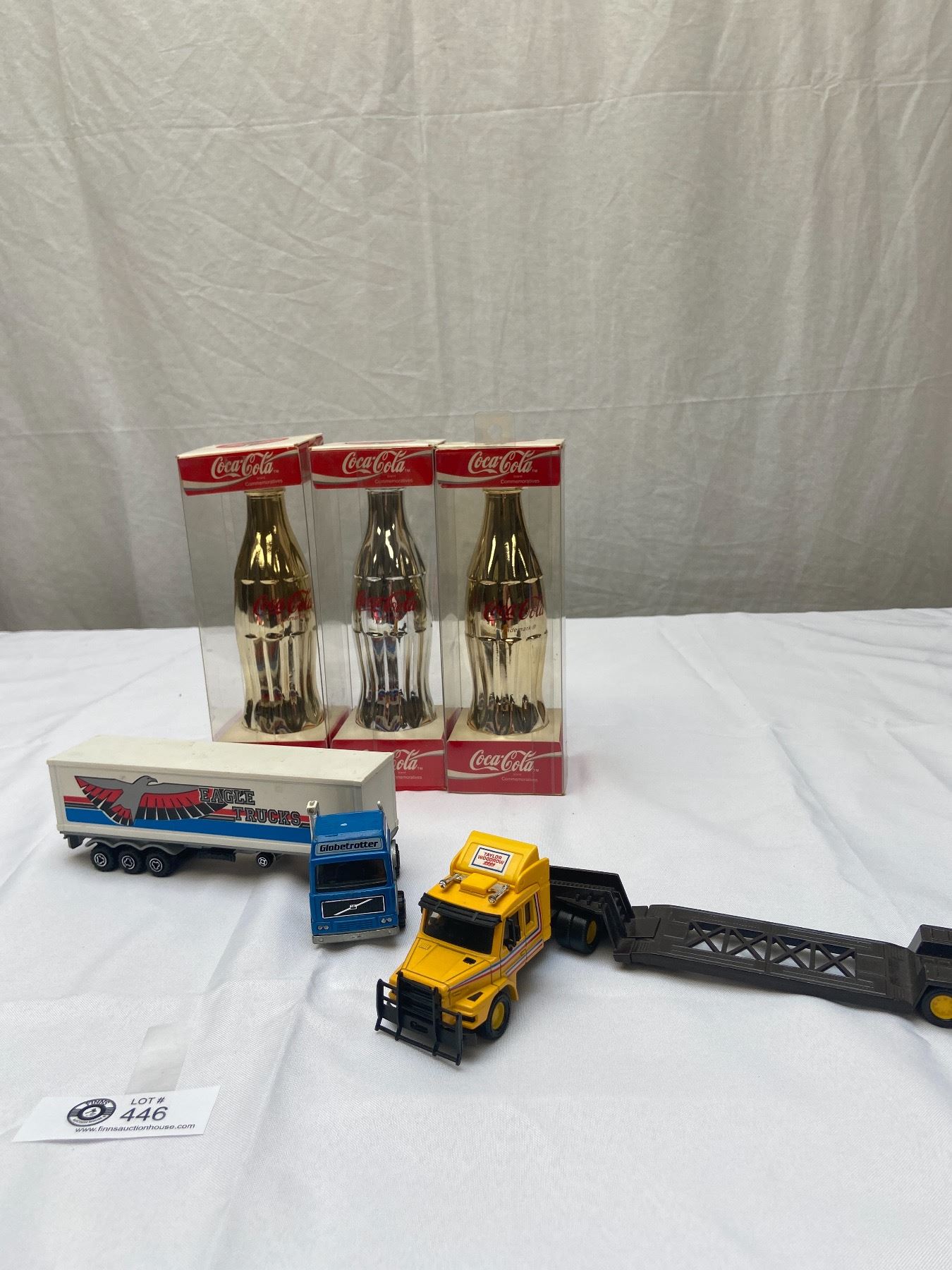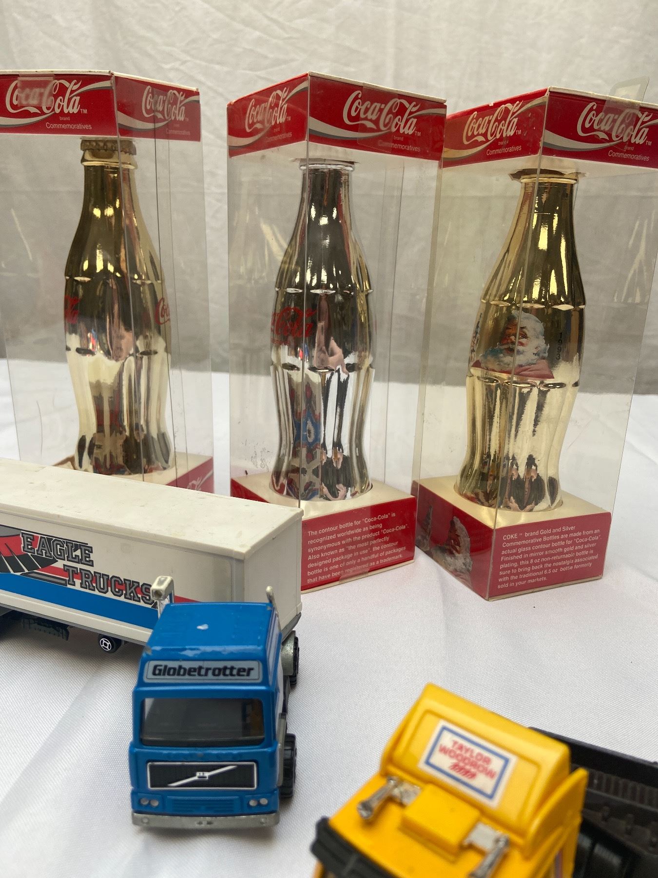A Nice Collectible Lot of 2 Gol Coca Cola Pop Bottles and a Silver Coca Cola Pop Bottle in Case Plus 2 Toy Trucks