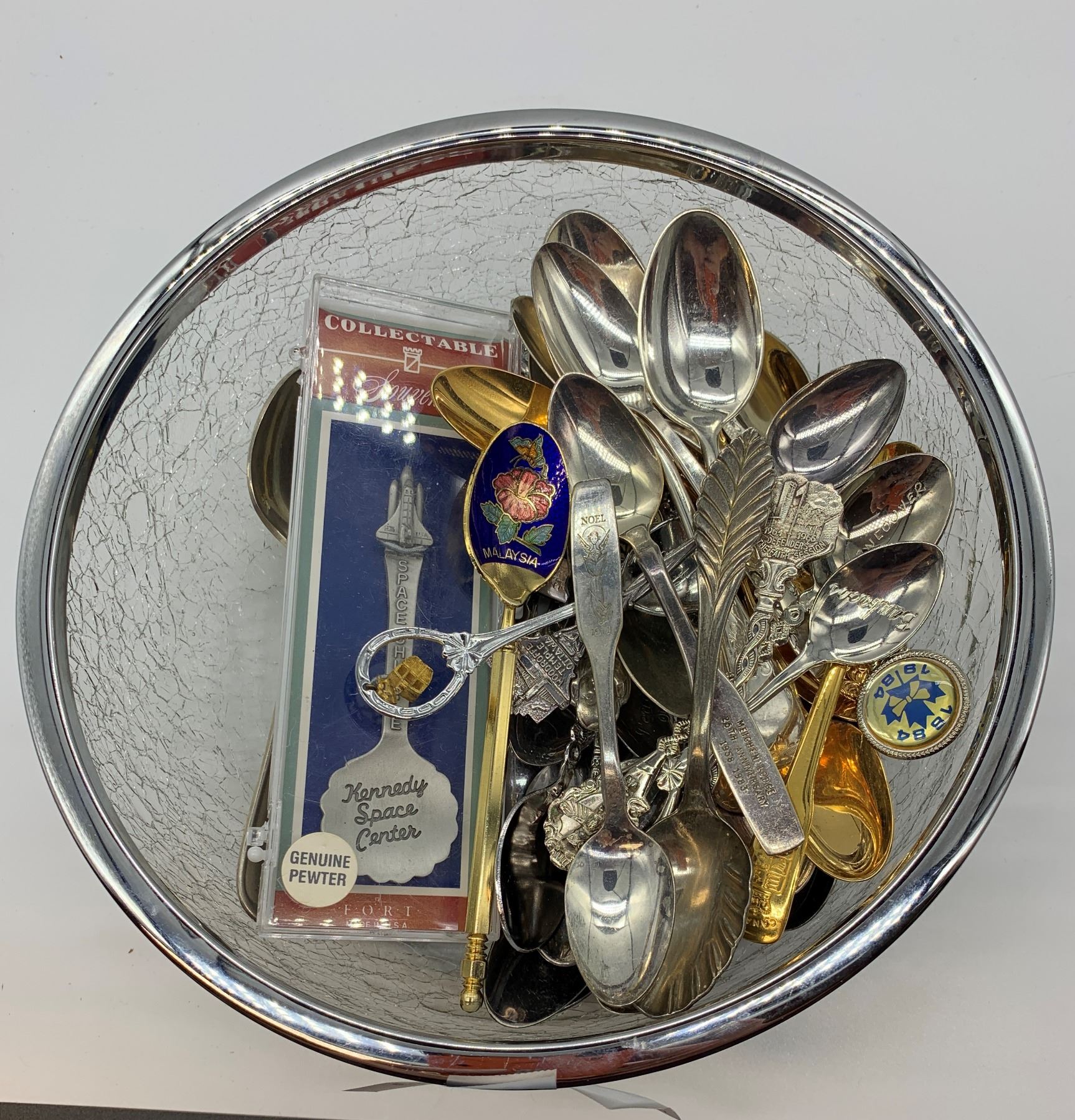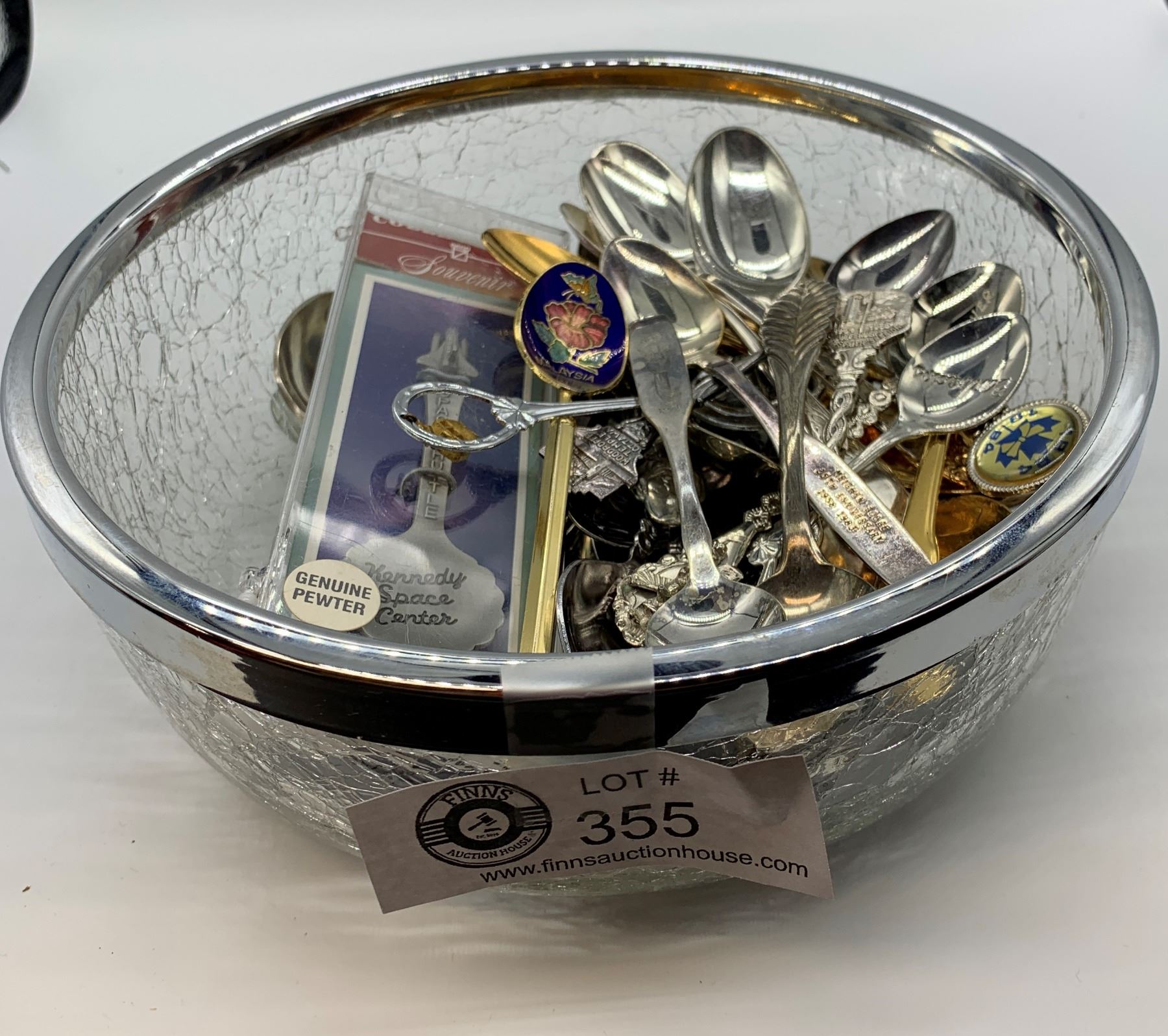 A Nice Glass Bowl with Silver Rim Filled with Collectible Spoons