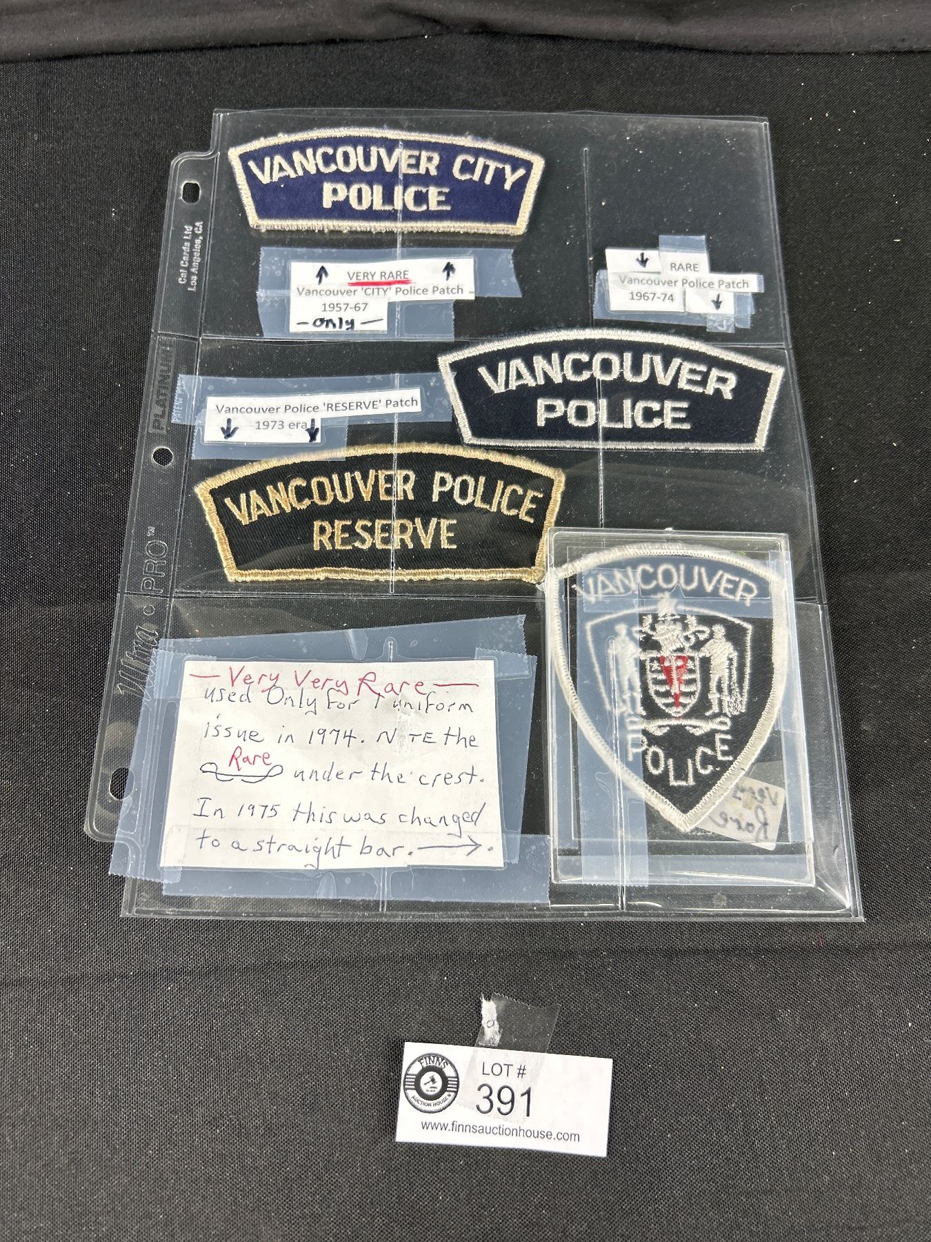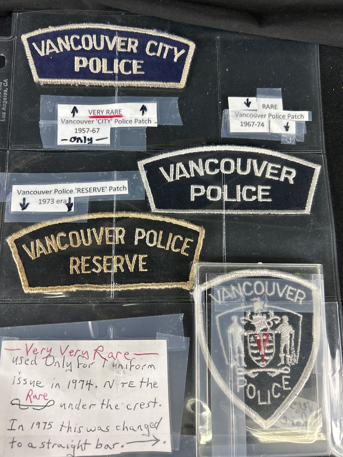 A Plastic Sheet with 4 Rare Defunct Vancouver Police Arm Patches