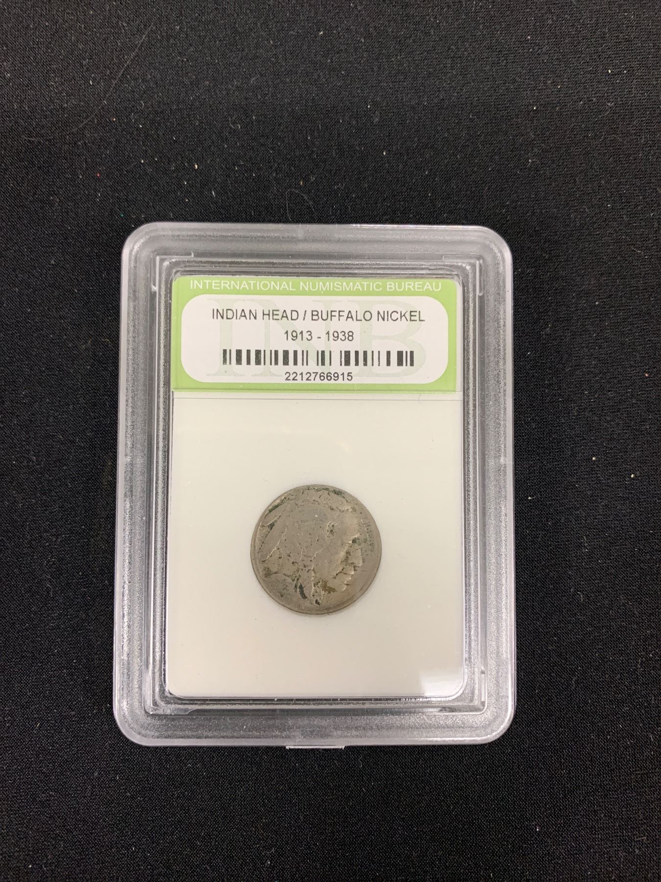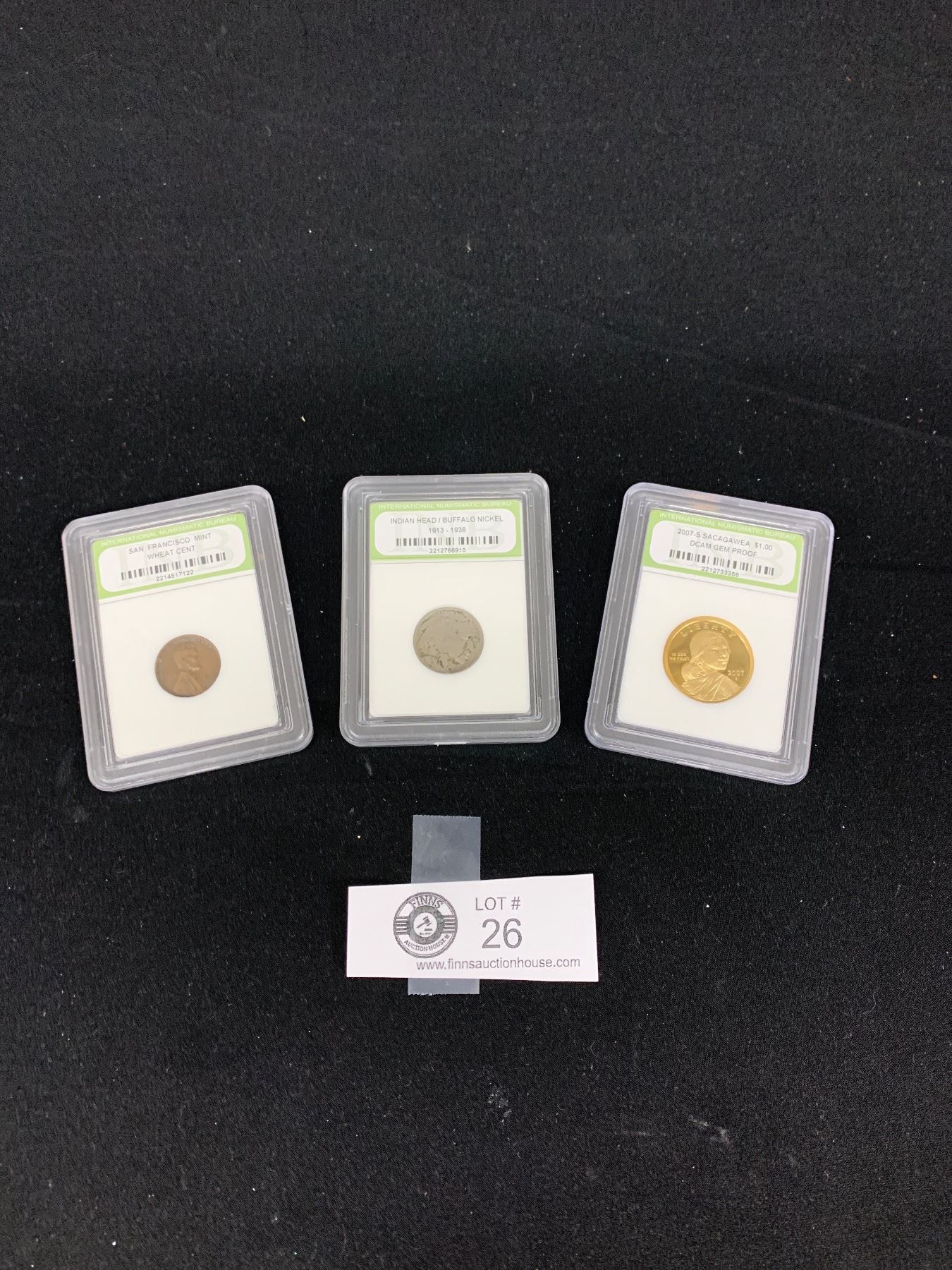 A US Buffalo Nickel a Wheat Cent and a Sacagawea Dollar Coin in Cases