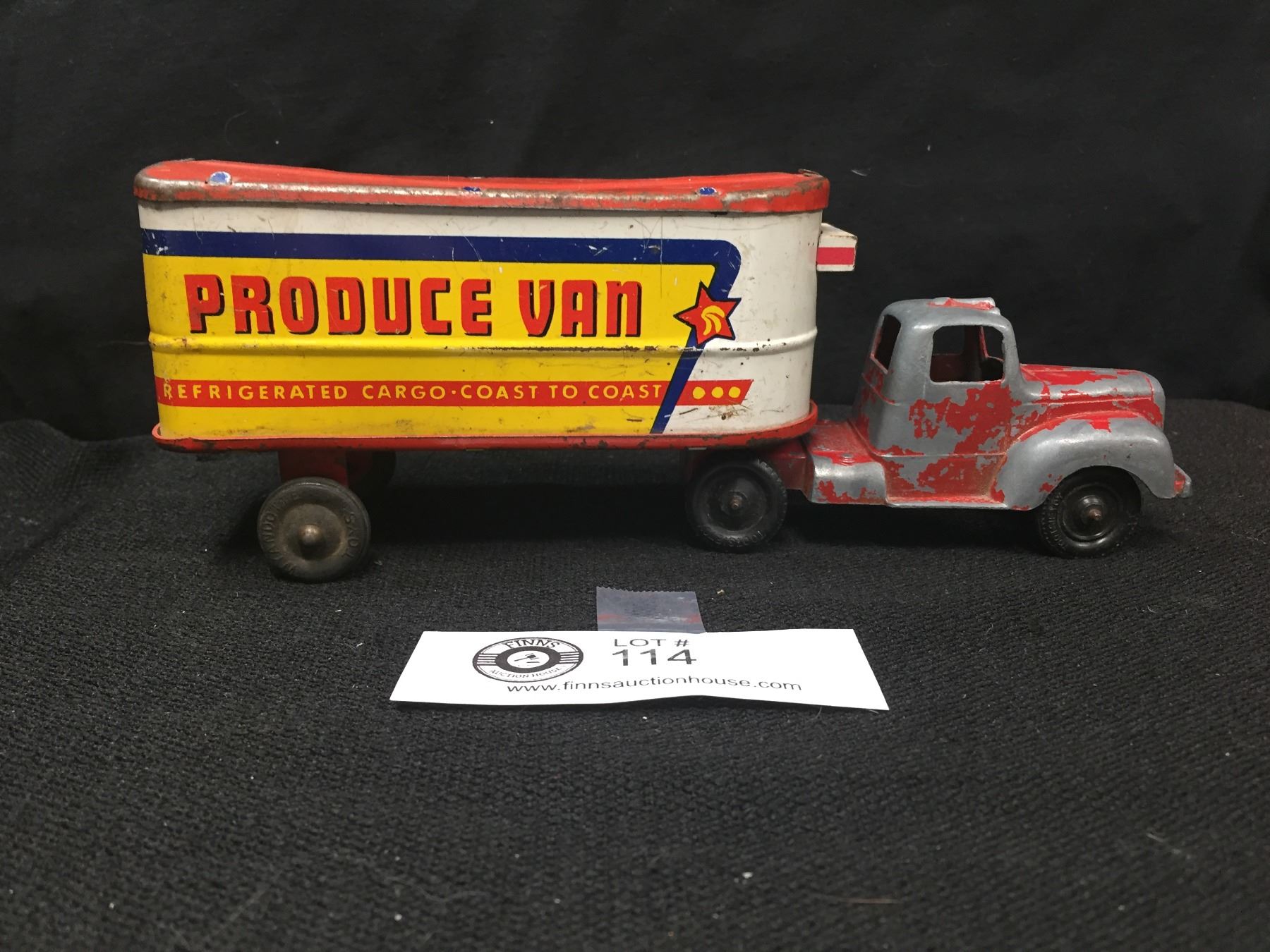 A Vintage Tootsie Toy Truck with a Wyandotte Trailer Produce Van. Refridgerated Cargo Coast to Coast