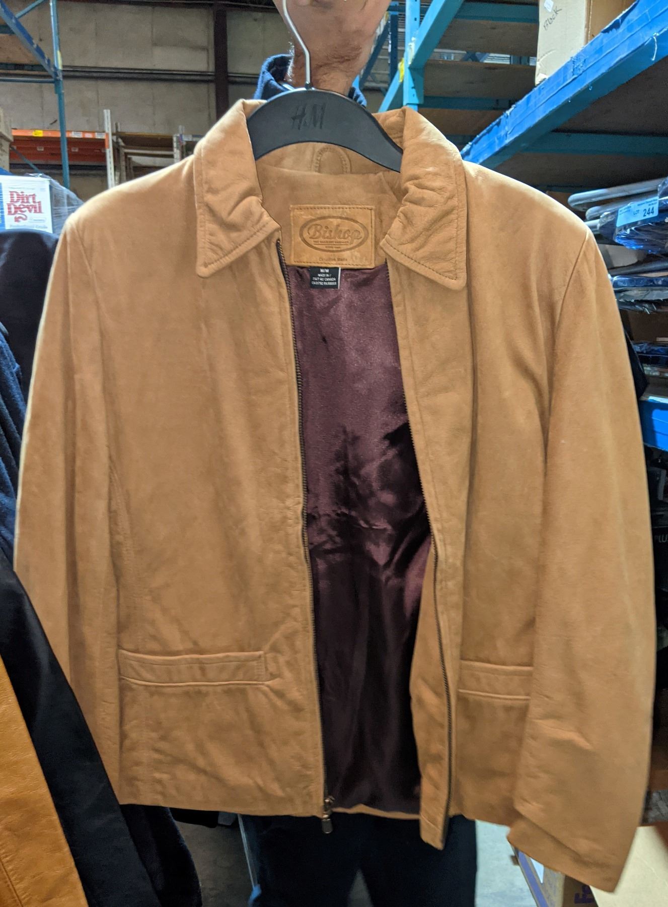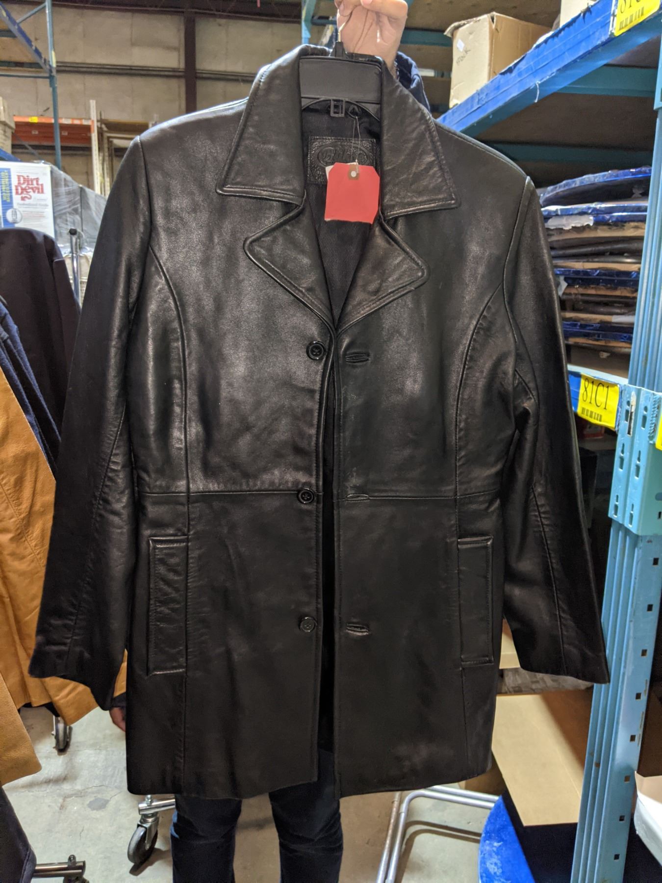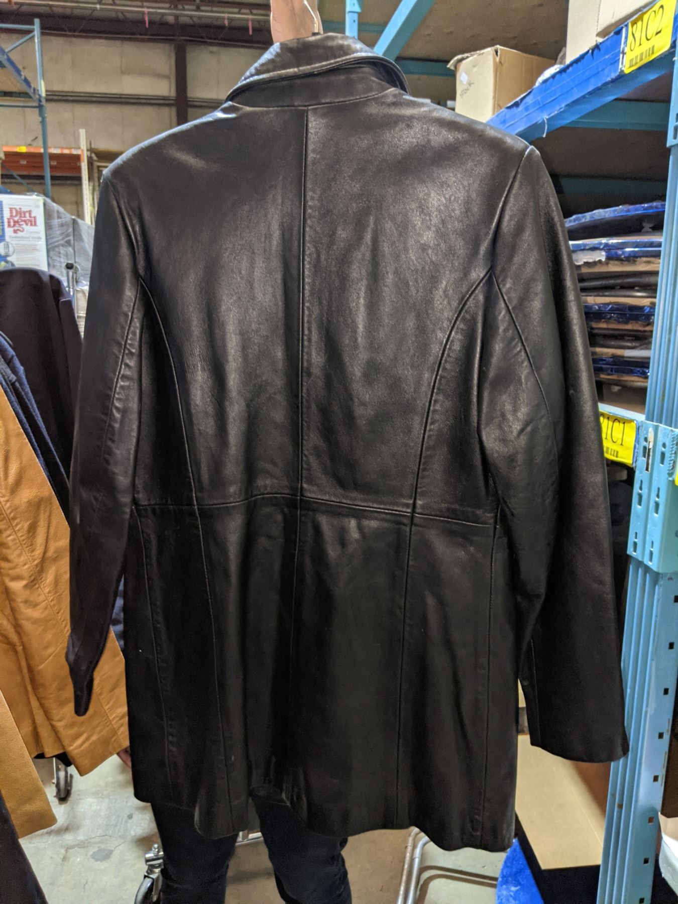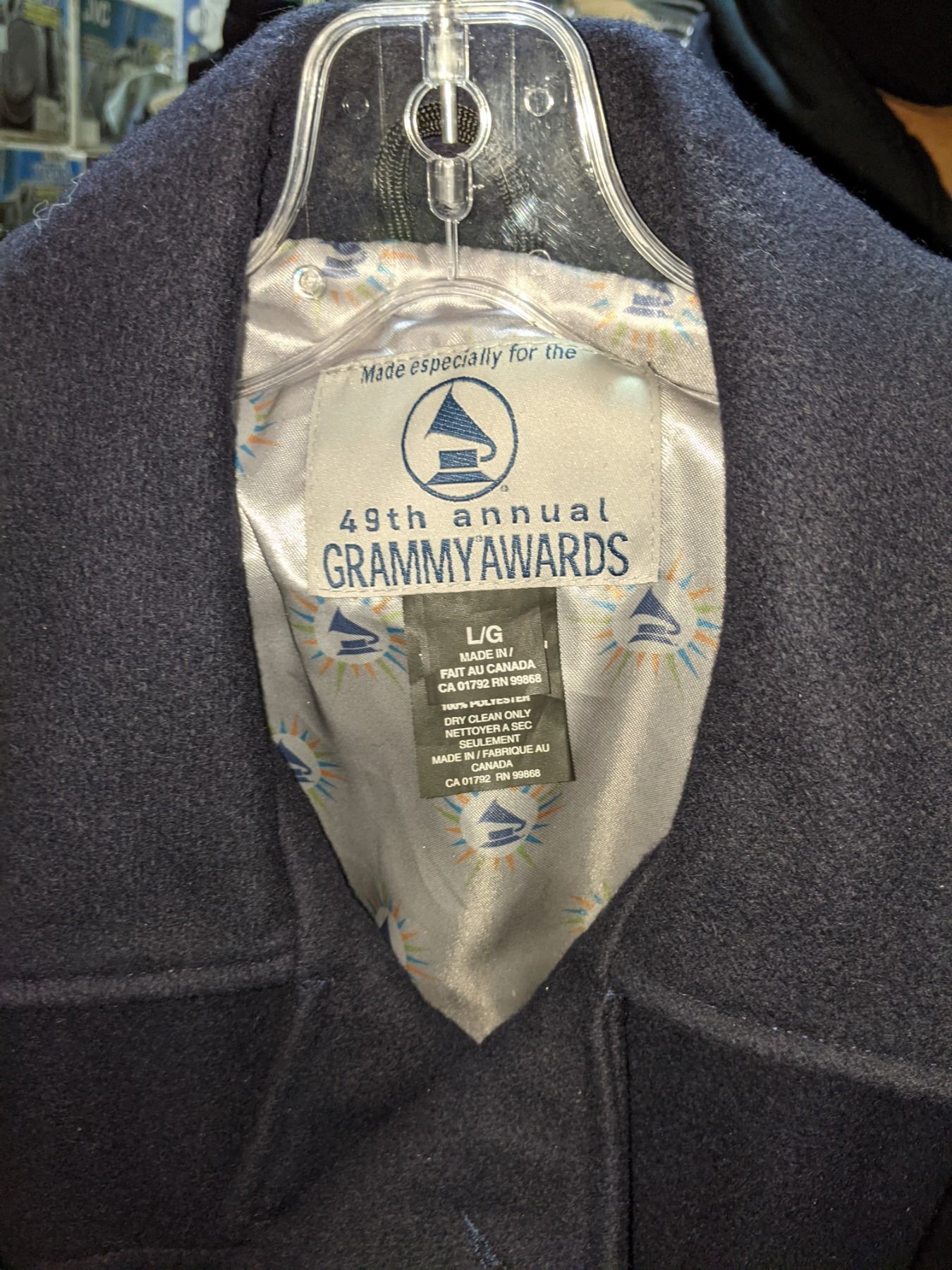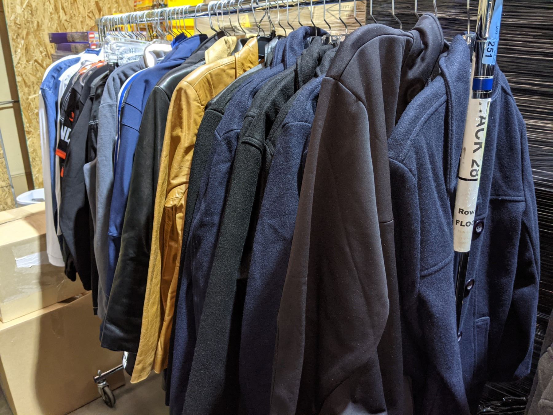 A rack full of jackets(especially made for 49th annual Grammy awards) leather jackets and other clothes