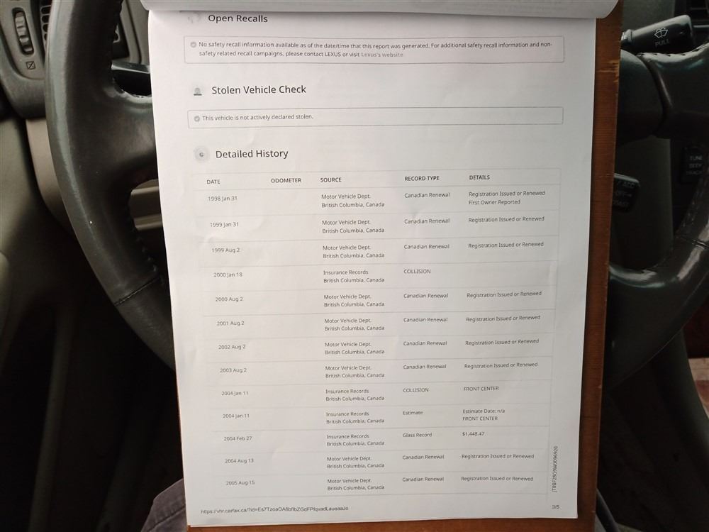 Automatic transmission and 3.O Litre Engine, 6 cylinder , Front Wheel Drive, 235335 KilometersSilver, 5 PassengerDeclarations -, Damage Claims, 2 CLAIMS + 1 GLASS TOTAL $8045 , Power Steering, Power Brakes, , Intermittent Wipers, AM/FM Stereo , Rear Defroster, Bucket Seats, Anti Lock Brakes, Front Disc Brakes-Air Conditioning, Power Windows, Power Locks, Tilt Steering, Cruise Control, Alloy Wheels, Anti Theft, Power Sunroof, CD Player, Leather Seats, Power Seats, Heated Seats, Memory Seats, Traction ControlAuction Notes :