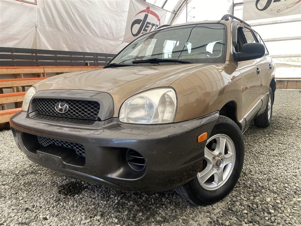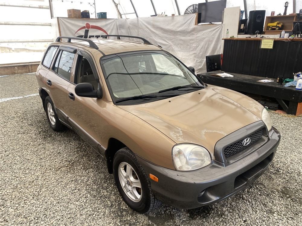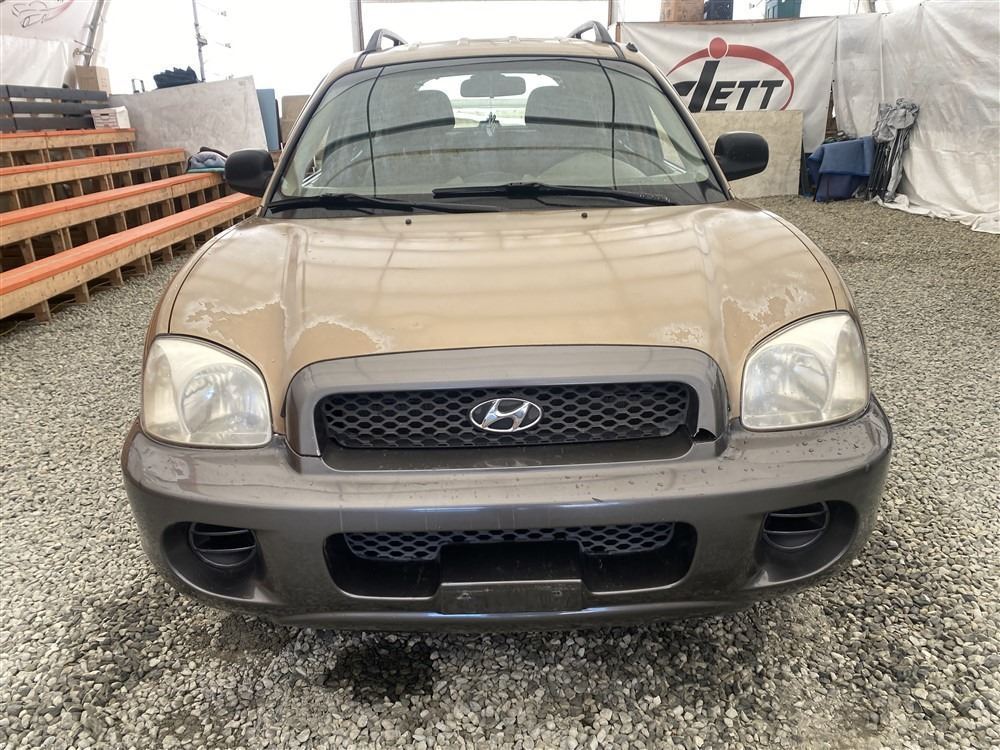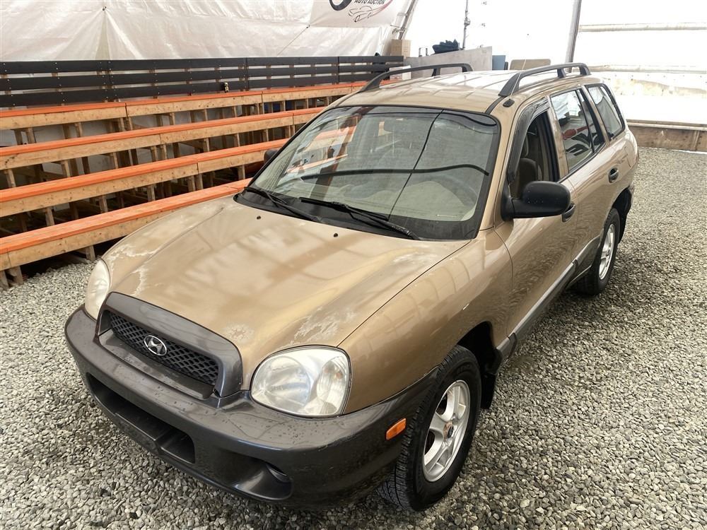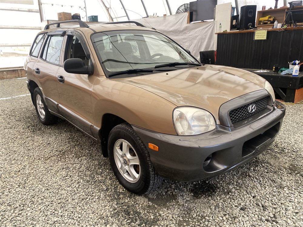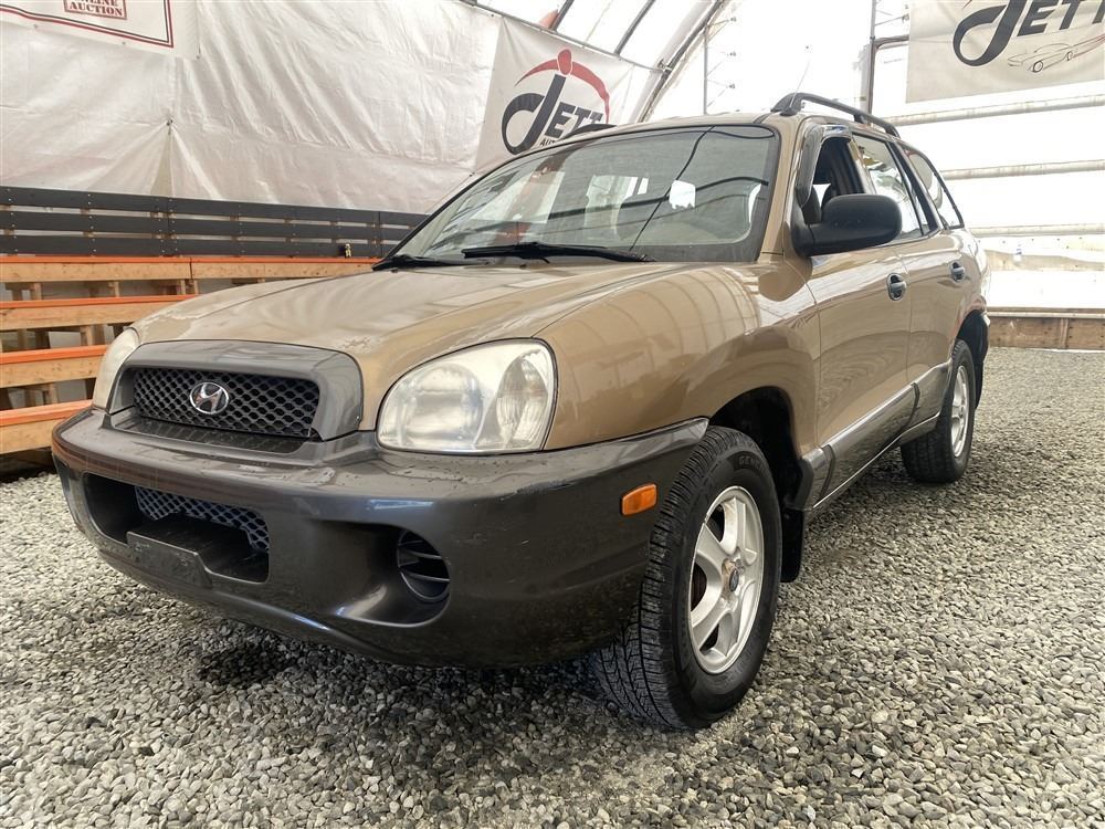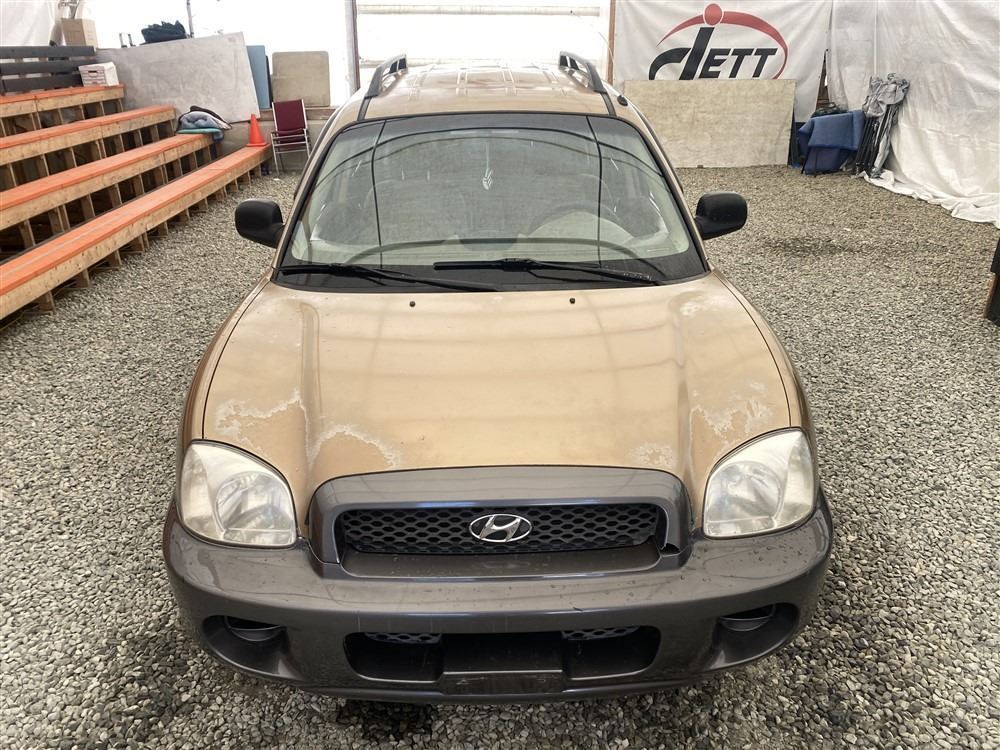 "2002 HYUNDAI SANTA FE GL, GOLD, 213088 KMS, 2.4L, 4 CYLINDER, GASOLINE, MANUAL, TRANSMISSION, FRONT WHEEL DRIVE, 5 PASSENGER. DECLARATIONS:1 ACCIDENTS, 0 GLASS CLAIM, TOTALING $638.POWER WINDOWS, TILT STEERING, ALLOY WHEELS, ANTI THEFT, DUAL AIR BAGS, CD PLAYER, AFTERMARKET STEREO, ROOF RACK, POWER MIRRORS, SPLIT-FOLDING REAR SEATS, AUCTION NOTES: NOT SUITABLE FOR TRANSPORTATION, MUST TOW