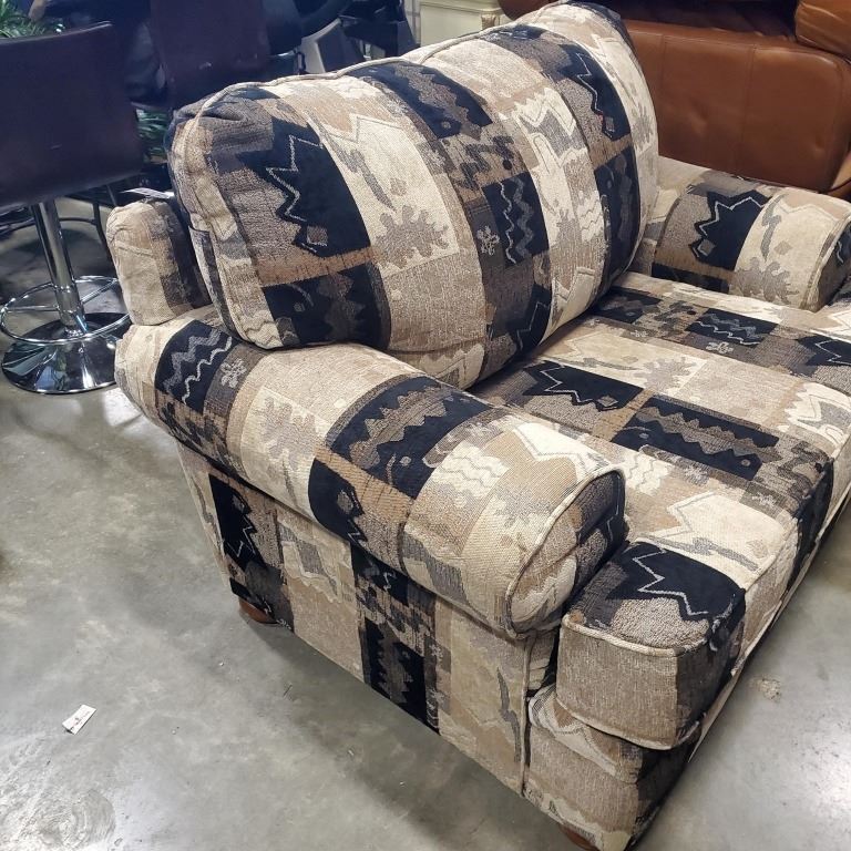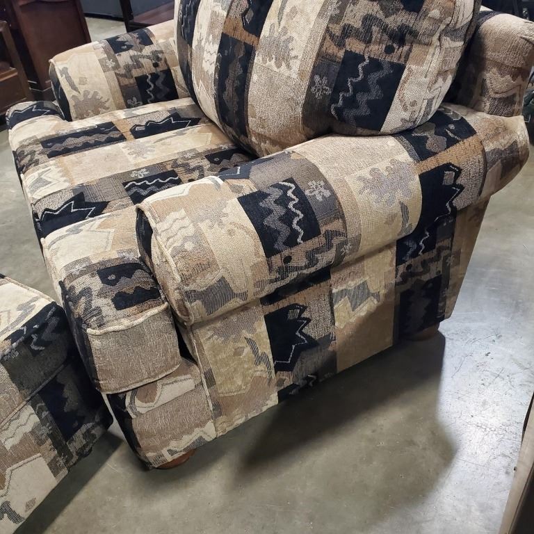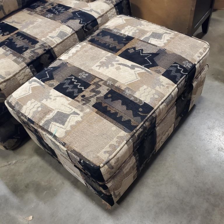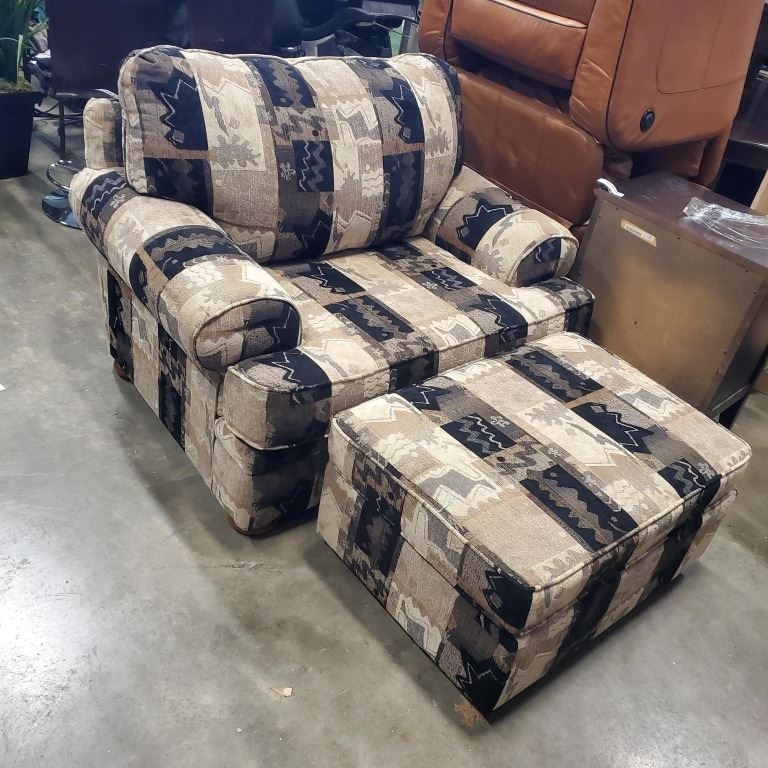 ABSTRACT LIVING ROOM CHAIR AND ROLLING STORAGE OTTOMAN