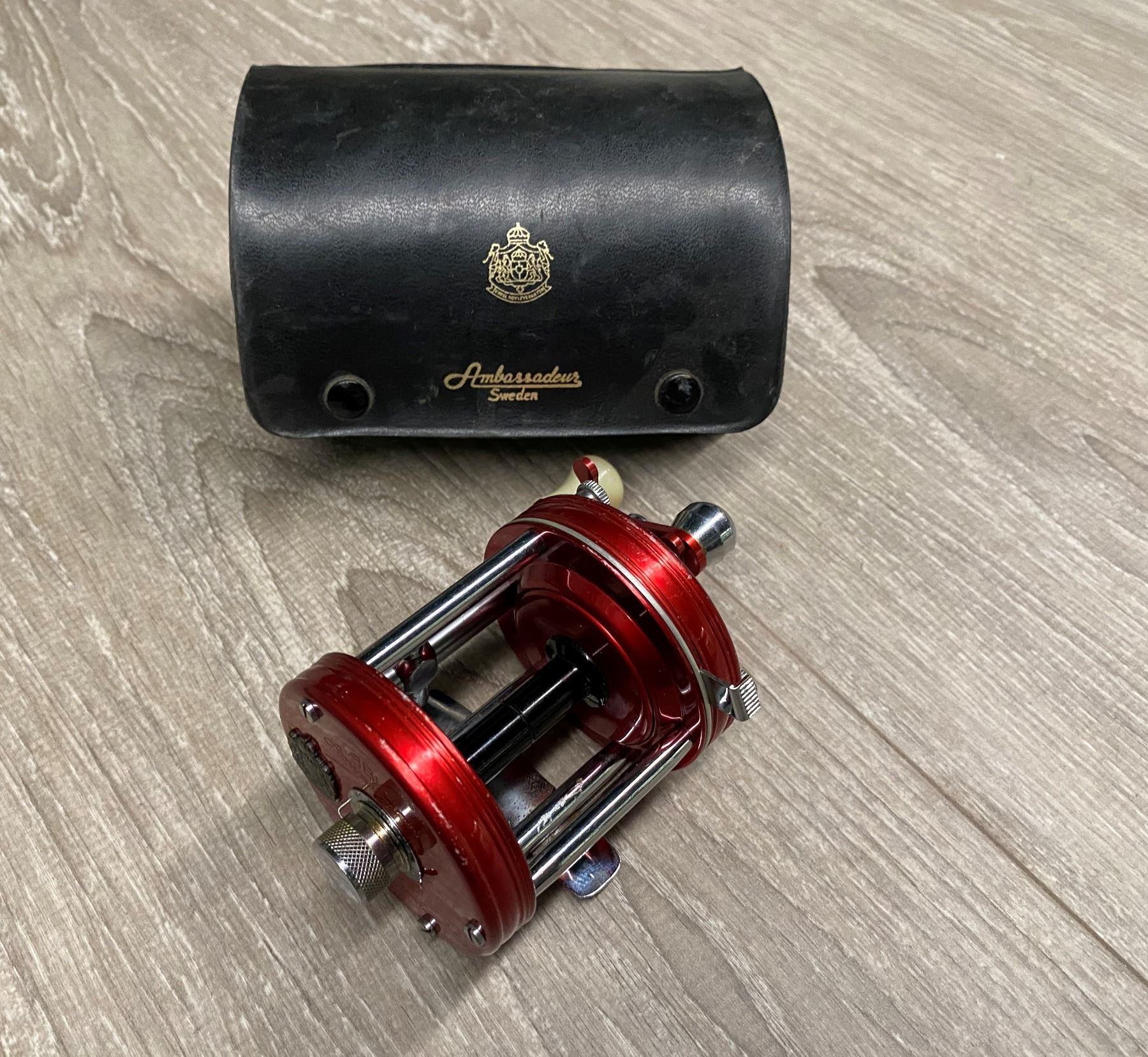 ABU Garcia ambassadeur 6000 red level-wind reel w/ leather case