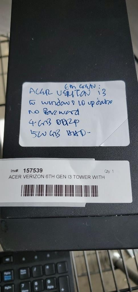 ACER VERIZON 6TH GEN I3 TOWER WITH WINDOWS 10 UPDATES, NO PASSWORD 4 GB DDR3 RAM, 500GB HDD