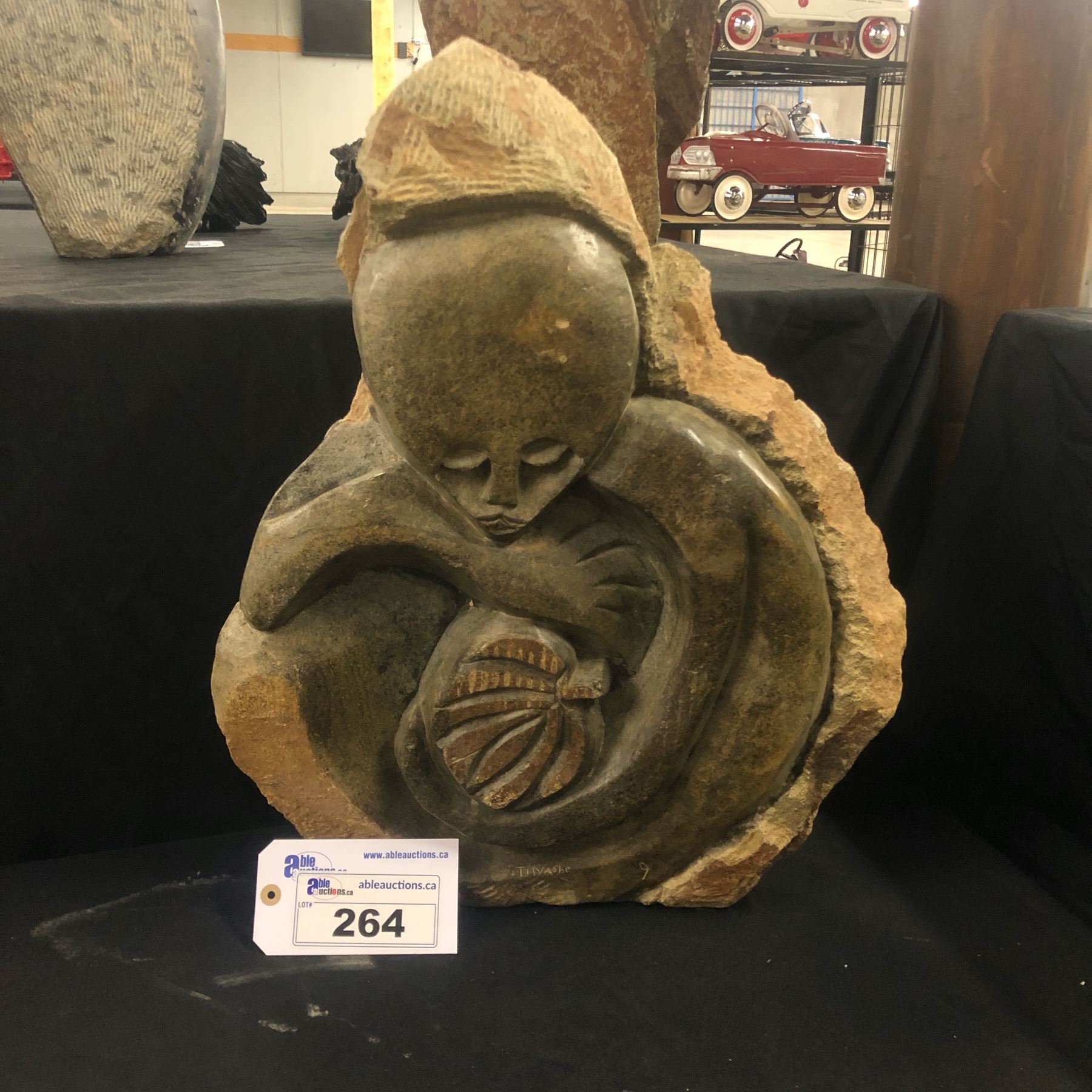 AFRICAN SHONA SOAP STONE STATUE, CHILD WITH BANANAS, SIGNED BY ARTIST, "TINASHE", 22.5" TALL