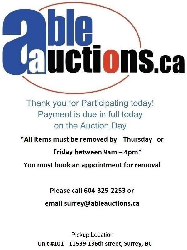 Payment is due in full today. You can authorize us via email or calling 604-325-2253 we can directly charge your Visa or MC on file for any purchases under $999. For e-transfers please email them to payment@ableauctions.ca Due to social distancing, we will not be taking in person payments. Payments above $999.00 we will need to have an e transfer, wire or direct deposit. To reduce the amount of people in the building at one time we ask you call to book a time slot for pick up. **Please make sure you are able to make your scheduled pick up time. Due to the amount of people rescheduling their pick-up times we find it necessary to implement a $50 rescheduling fee for rescheduling. It is important for the health and safety of our staff and other bidders that you show up on time. If you don’t make your scheduled time you will need to send an e transfer to payment@ableauctions.ca $50 before you will be allowed to bid at future auctions. **