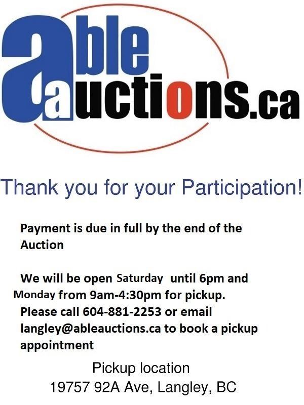 Payment is due in full today. You can authorize us via email or calling 604-881-2253 we can directly charge your Visa or MC on file for invoices under $999. For invoices over $999 please send e-transfers to payment@ableauctions.ca Due to social distancing, we will not be taking in person payments. To reduce the amount of people in the building at one time we ask you call to book a time slot for pick up.