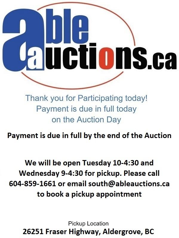 Payment is due in full today. if you authorize us by calling 604-859-1661 we can directly charge your Visa or MC on file (only applies to purchases under $999). For e-transfers please email them to payment@ableauctions.ca Due to social distancing, we will not be taking in person payments. To reduce the amount of people in the building at one time we ask you call to book a time slot for pick up.