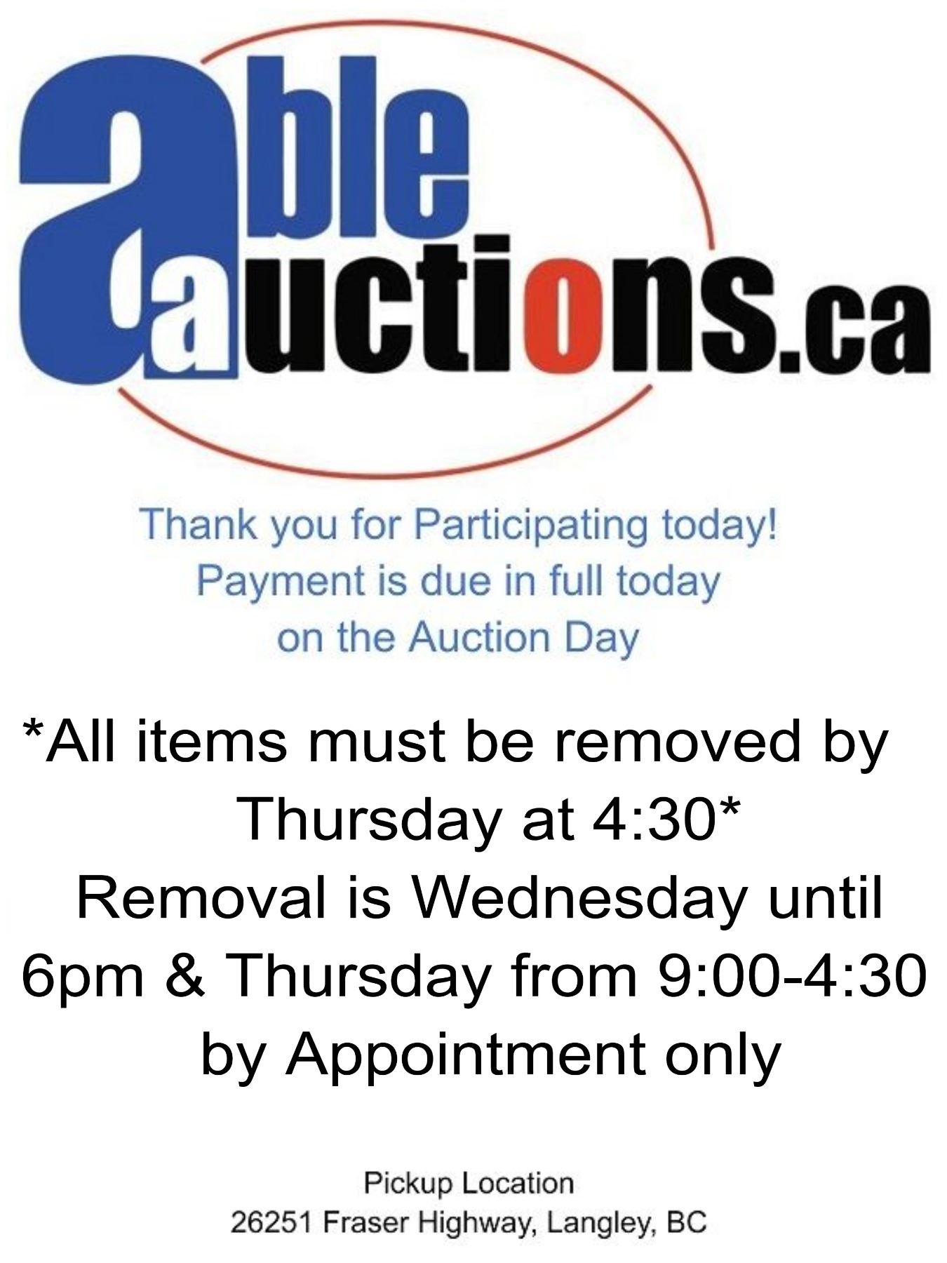 Payment is due in full today. if you authorize us via email or calling 604-859-1661 we can directly charge your Visa or MC on file (only applies to purchases under $999). For e-transfers please email them to payment@ableauctions.ca Due to social distancing, we will not be taking in person payments. To reduce the amount of people in the building at one time we ask you call to book a time slot for pick up.