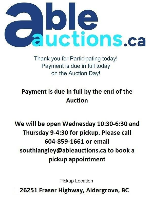 Payment is due in full today. if you authorize us by calling 604-859-1661 we can directly charge your Visa or MC on file (only applies to purchases under $999). *Please note we will need to have a verbal confirmation of the last 4 digits of your credit card to process the payment* For e-transfers please email them to payment@ableauctions.ca Payment is Online only. Pickup is by appointment please call to book a time slot.