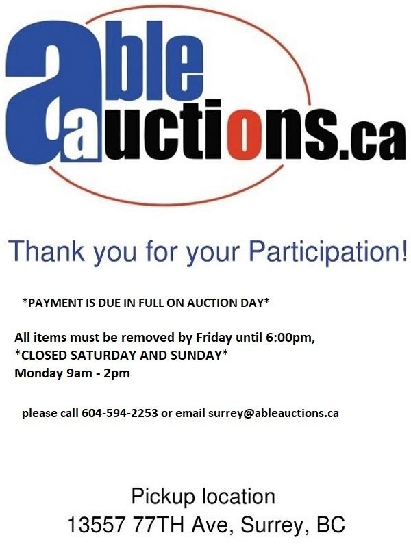 Pick up must be completed this Friday until 6pm or Monday between 9am and 2pm by appointment only. Pick up address is 13557 77th Avenue, Surrey BC. Contact us at 604-325-2253 or email Surrey@ableauctions.ca with any questions.