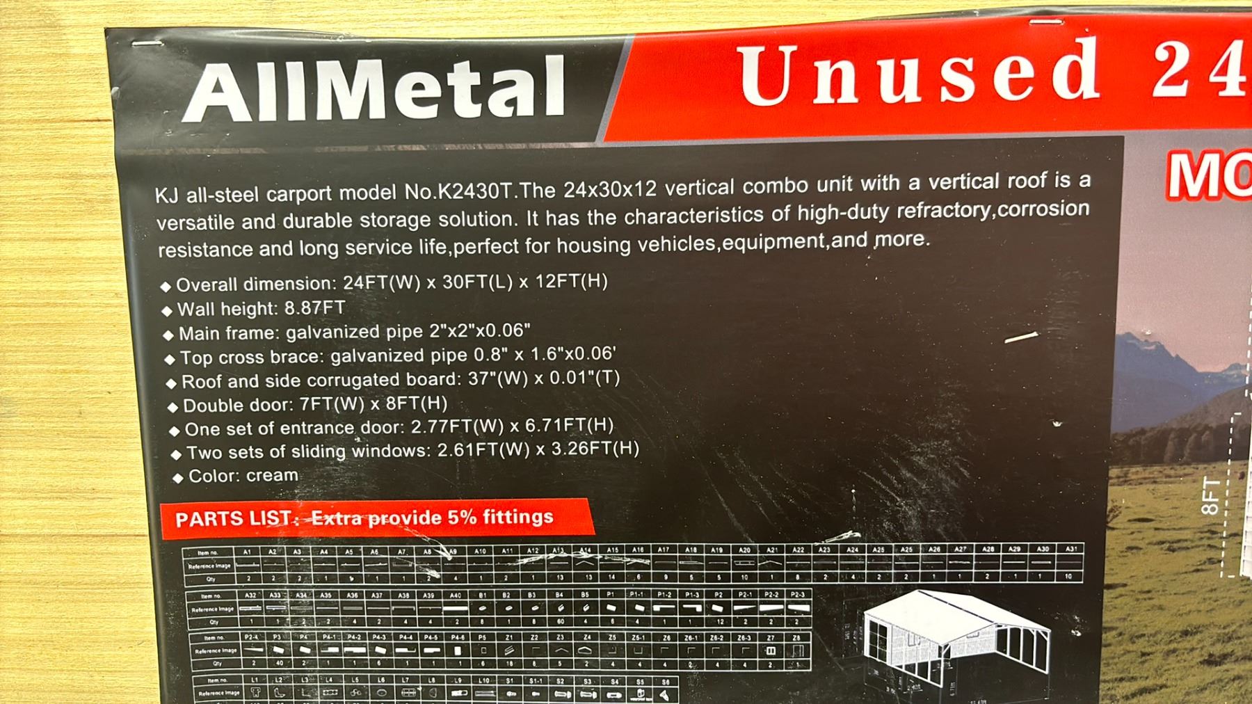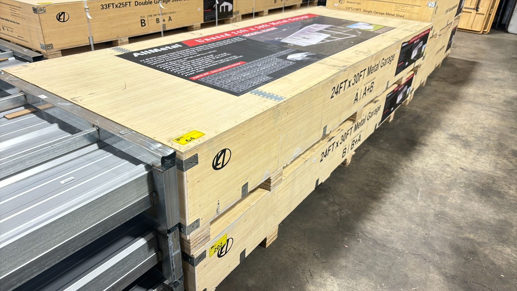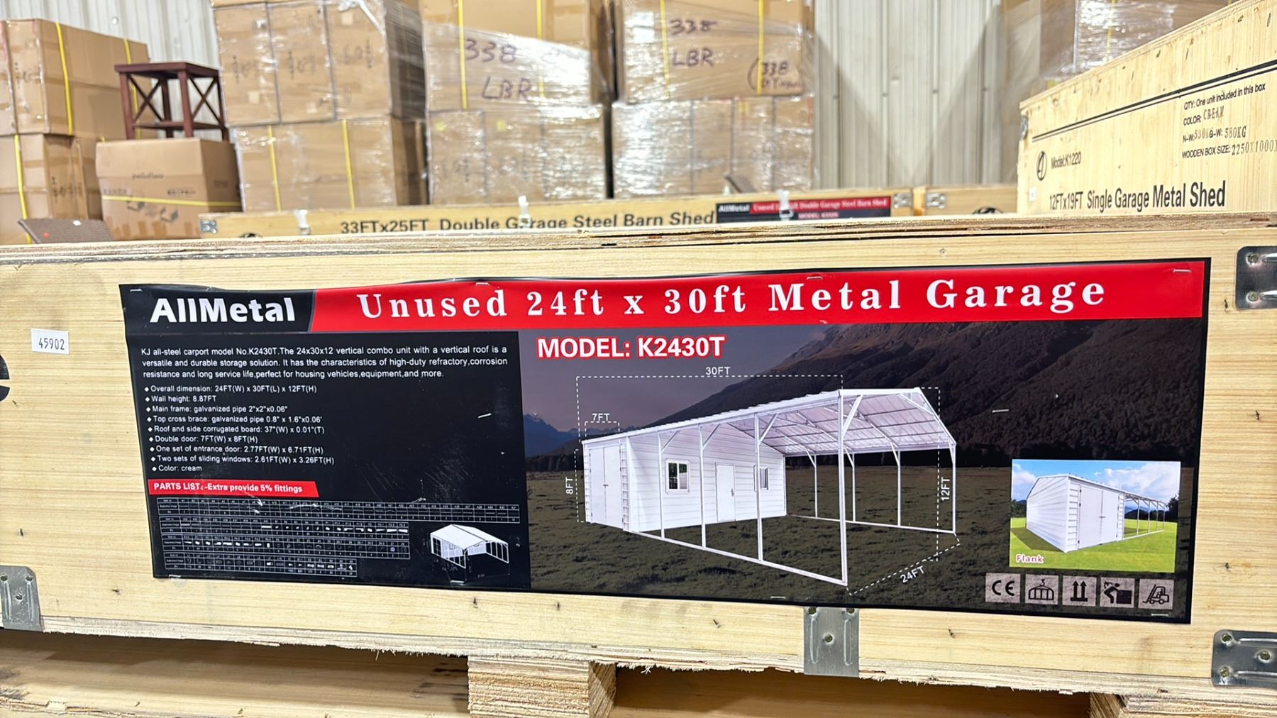 ALLMETAL K2430T UNUSED 24' X 30' SINGLE STEEL METAL OUTDOOR INDUSTRIAL GARAGE / SHED *IN CRATES* DIMENSIONS 24'W X 30'L X 12'H WITH SINGLE MAN DOOR, 2 WINDOWS & DOUBLE SIDE DOOR *2 CRATES A + B*