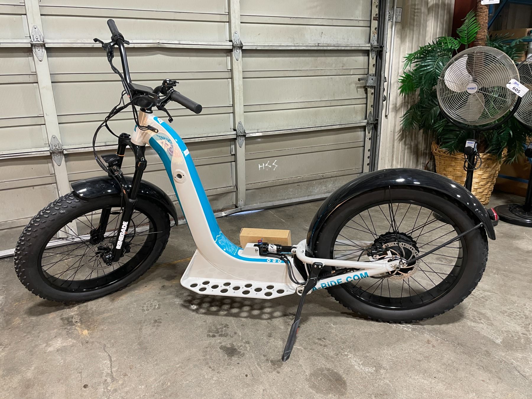 ALPINE RIDING A-RIDE PACIFIC COASTER FULL SUSPENSION ELECTRIC SIZE 24" FAT TIRE SCOOTER, WHITE, 1000W MOTOR, 180 DISC BRAKES, TEKTO HD E-350 CUT OFF, TFT DISPLAY, 35 MPH MAX SPEED, CUSTOM MADE PANASONIC 1356P 1000W BATTERY, 50 MILE RANGE, 3A CHARGER INCLUDED *DISPLAY ONLY*