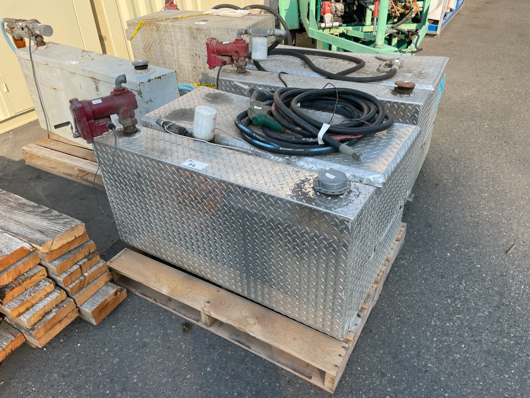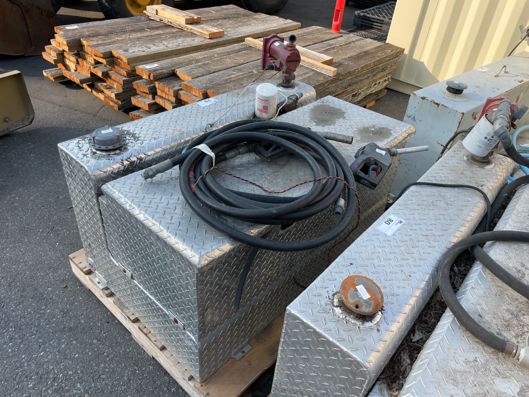 ALUMINUM CHECKER PLATE 48 W X 31 D X 24 H L-SHAPED FUEL / TOOL STORAGE BOX WITH FILL-RITE FUEL