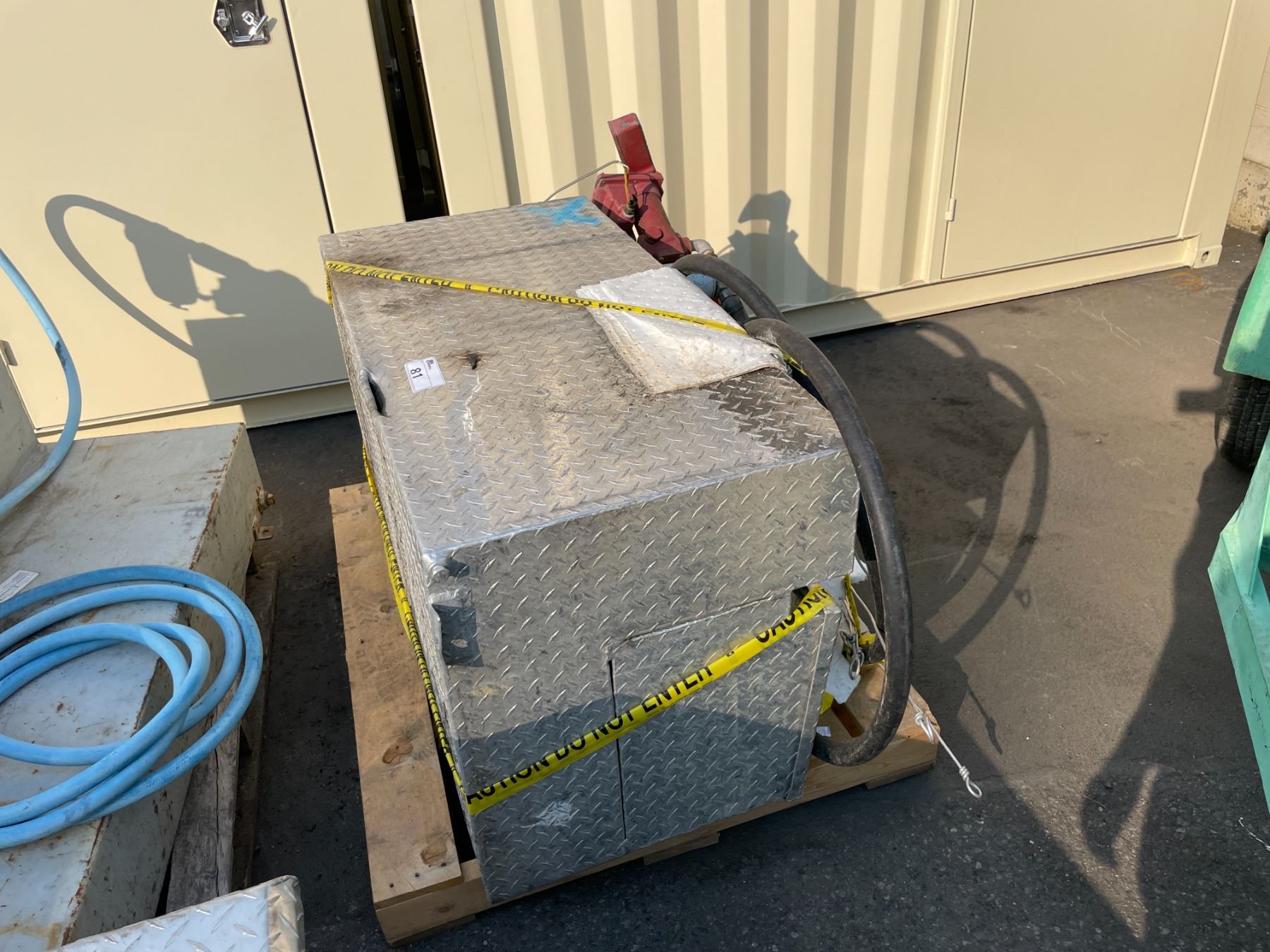 ALUMINUM CHECKER PLATE 48"W X 31"D X 24"H L-SHAPED FUEL / TOOL STORAGE BOX WITH FILL-RITE FUEL PUMP, HOSE & NOZZLE ( FORK PUNCTURE HOLE IN TANK )