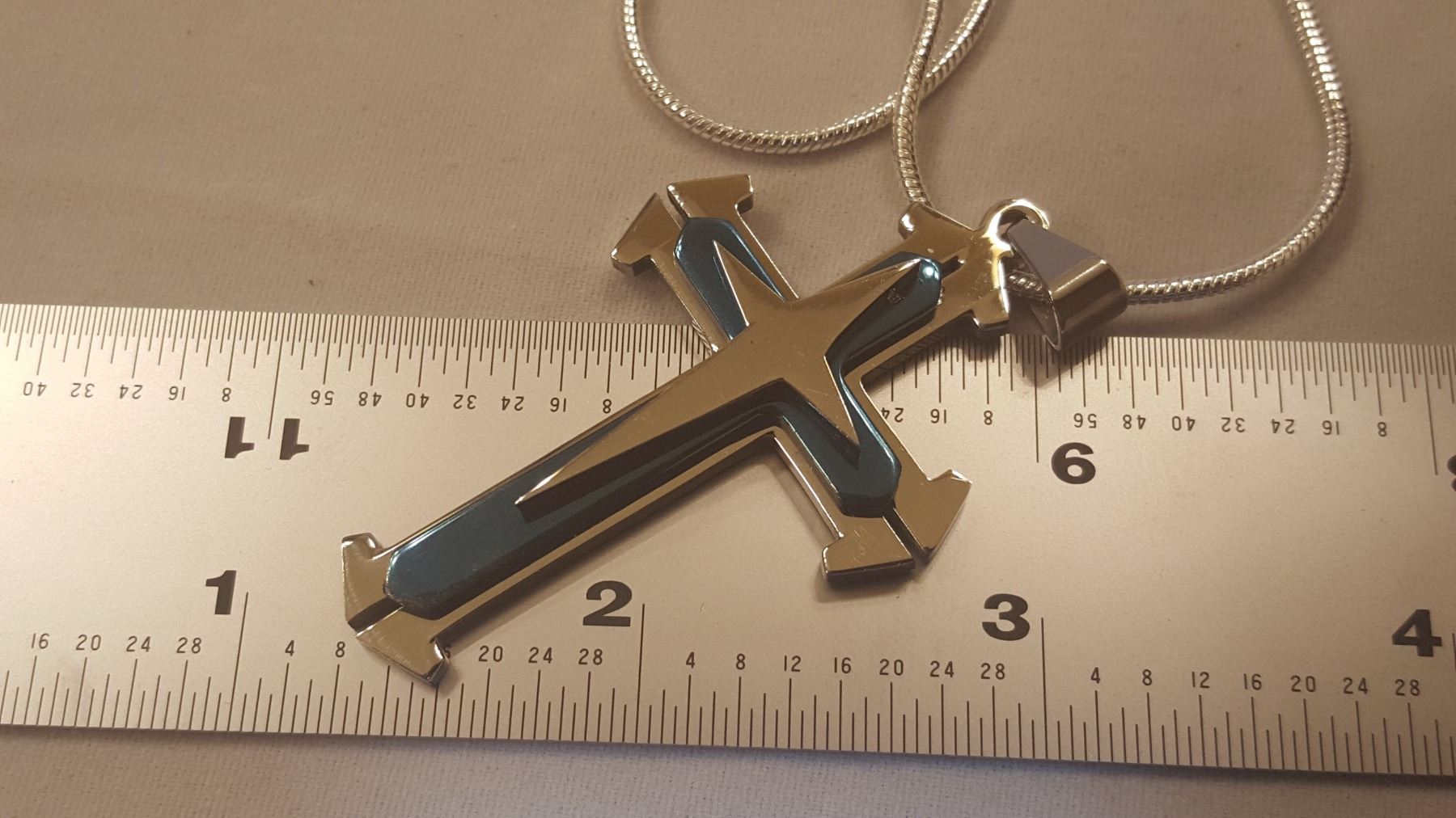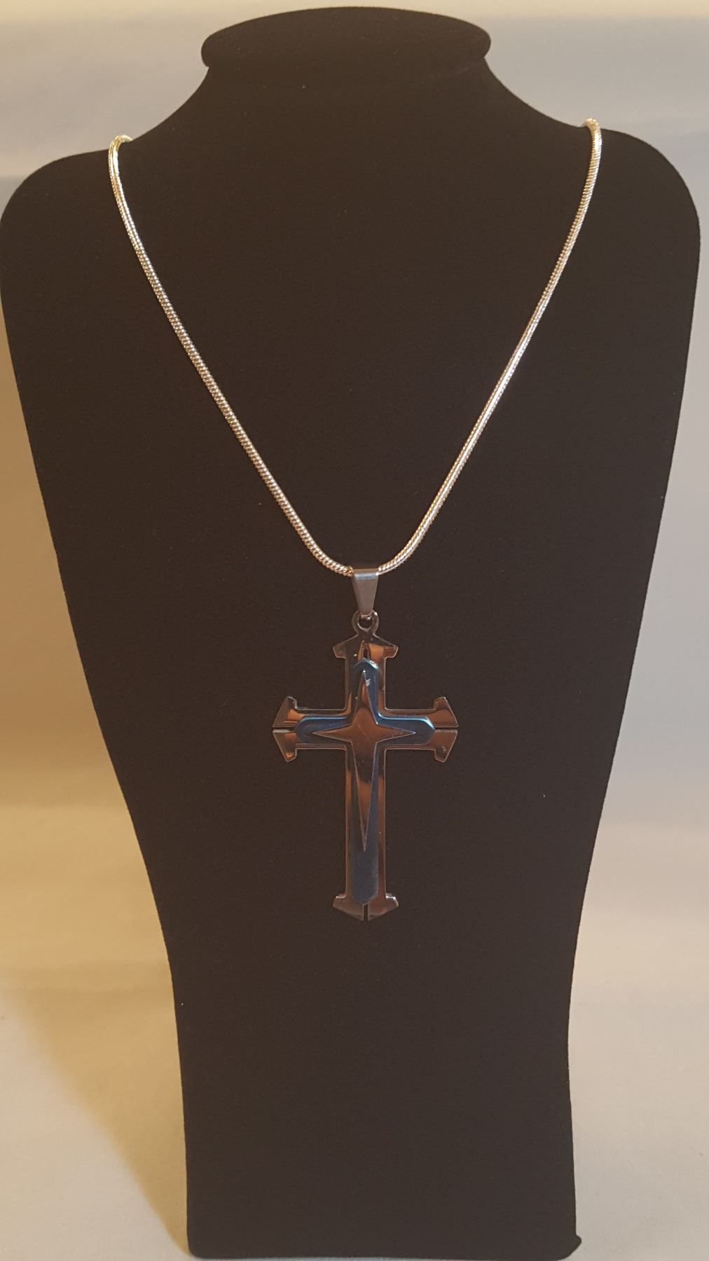 AMAZING MULTI COLOR MULTI DIMENTIONAL CROSS PENDANT. 2 " HIGH x 1.3 ' WIDE 22.2 GRAMS. MADE FROM HIGHLY POLISHED STAINLESS STEEL. 20 " 2 mm CHAIN INCLUDED. 22.4 GRAMS