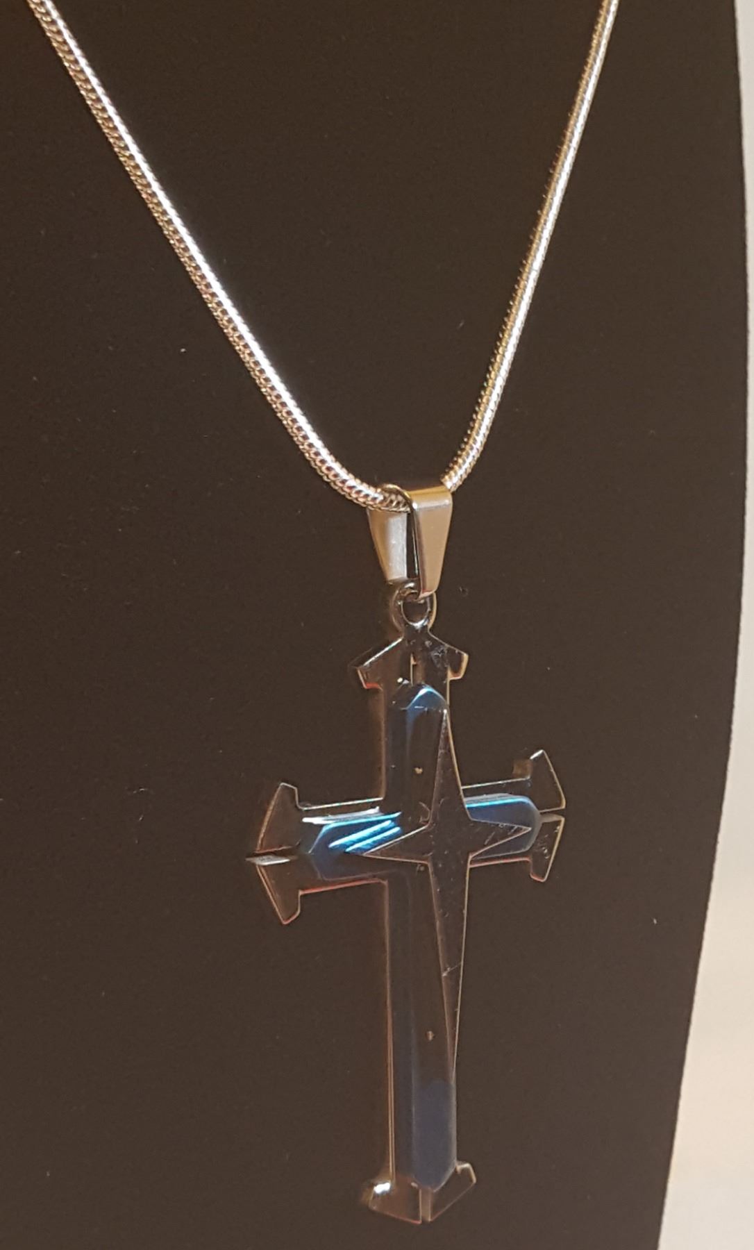 AMAZING MULTI COLOR MULTI DIMENTIONAL CROSS PENDANT. 2 " HIGH x 1.3 ' WIDE 22.2 GRAMS. MADE FROM HIGHLY POLISHED STAINLESS STEEL. 20 " 2 mm CHAIN INCLUDED. 22.4 GRAMS