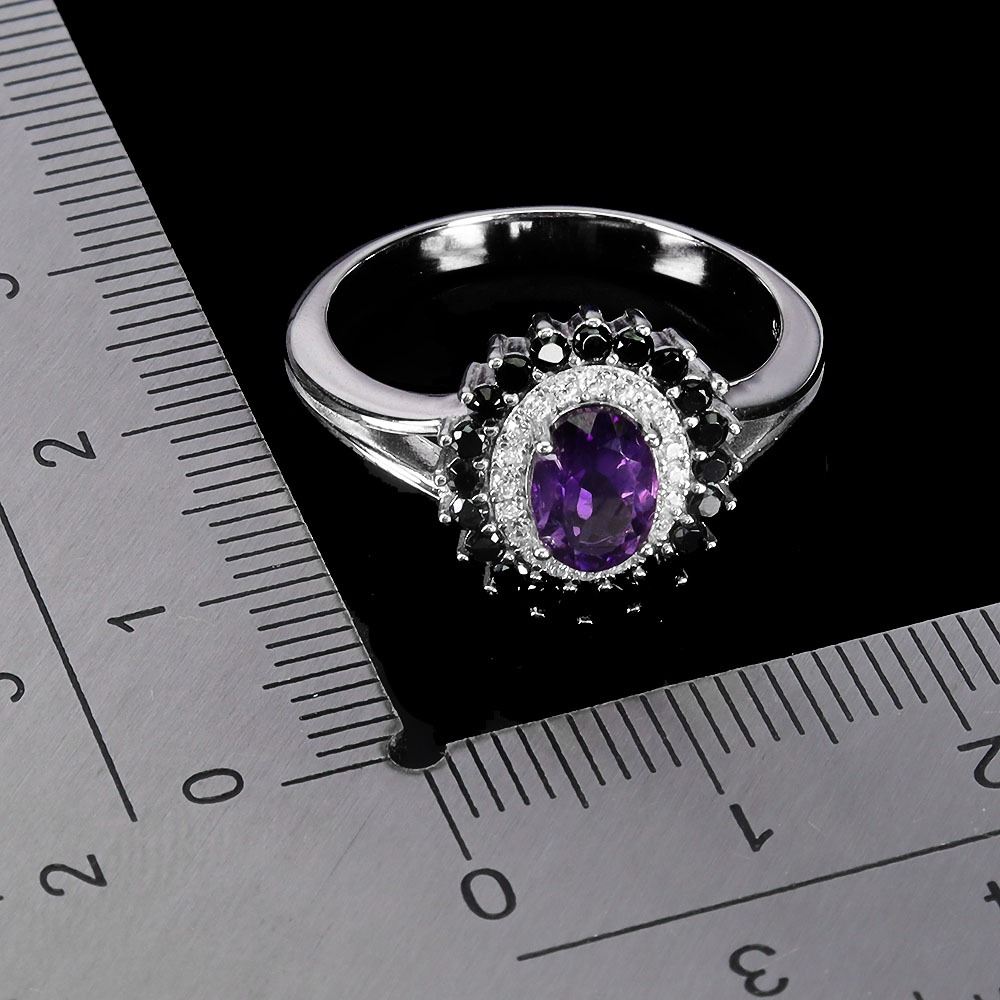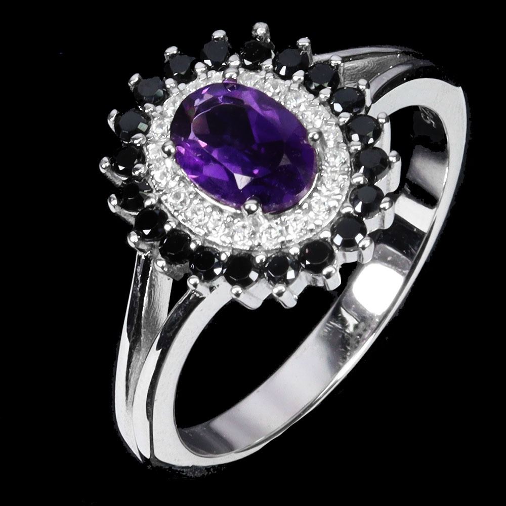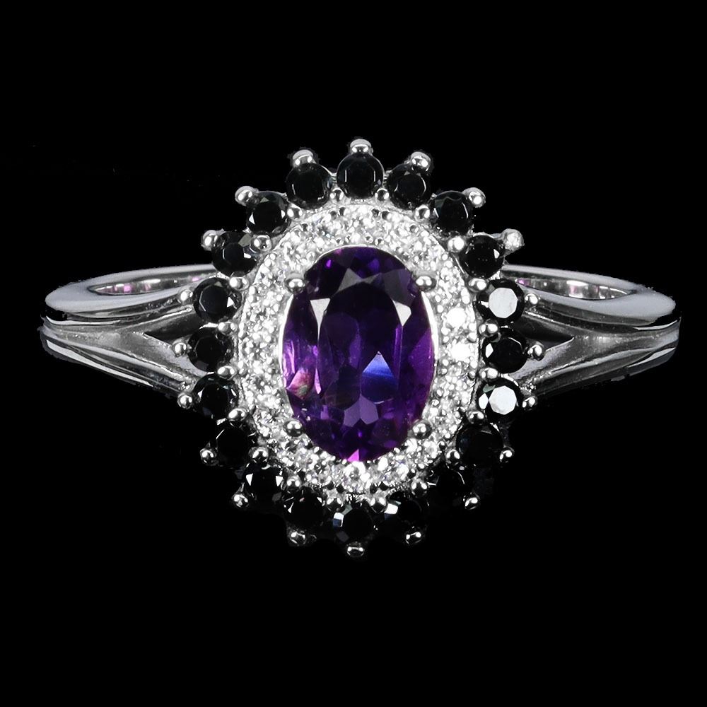 AMETHYST AND BLACK SPINEL RING IN 14K WHITE PLATED GOLD OVER 925 STERLING SILVER - SIZE 8 - APPRAISED REPLACEMENT VALUE