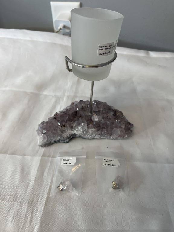AMETHYST CANDLE HOLDER AND 2 ROSE QUARTZ PENDANTS