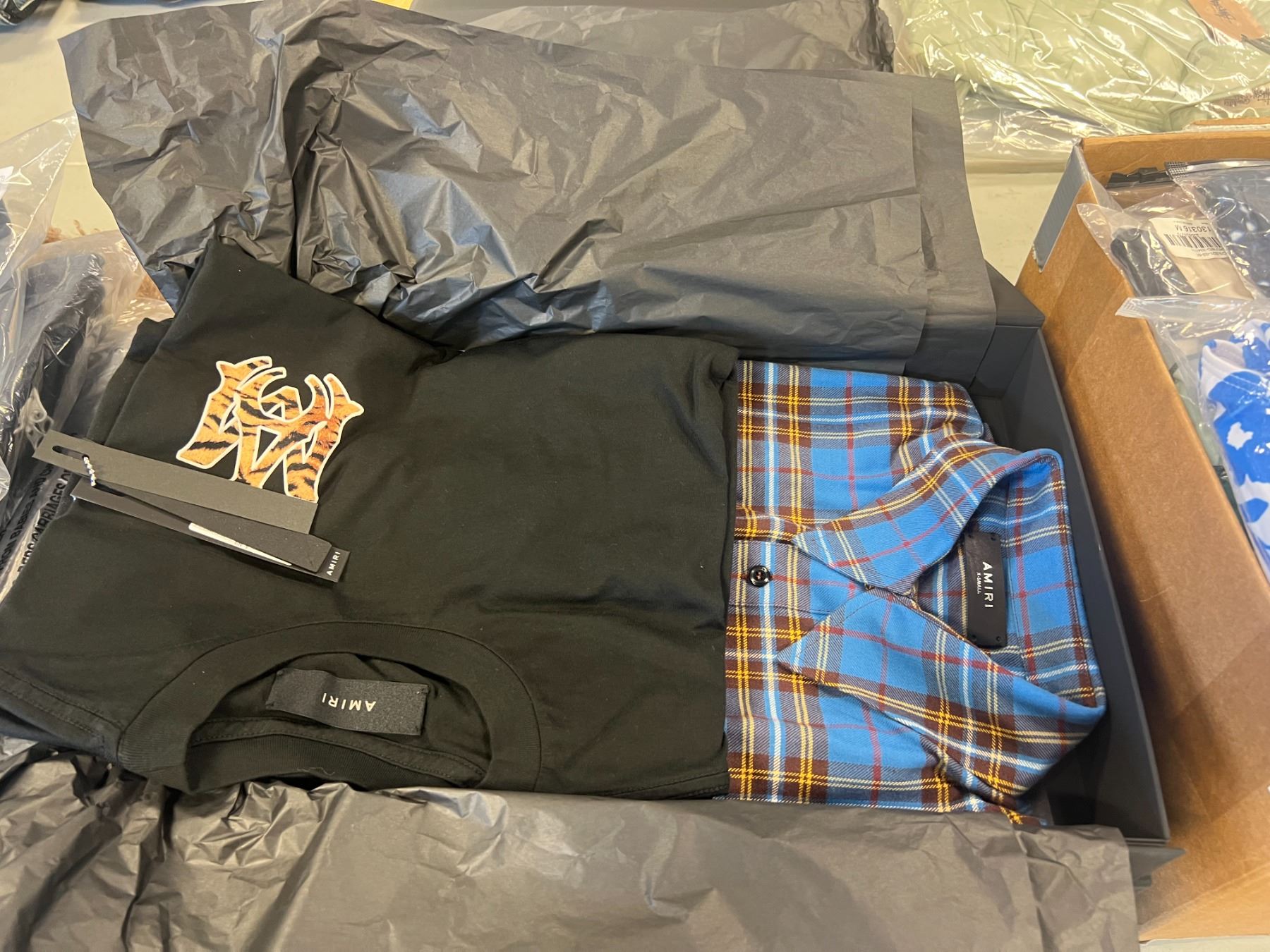 AMIRI BLACK SIZE S T-SHIRT AND AMIRI BLUE PLAID SIZE XS LONG SLEEVE SHIRT