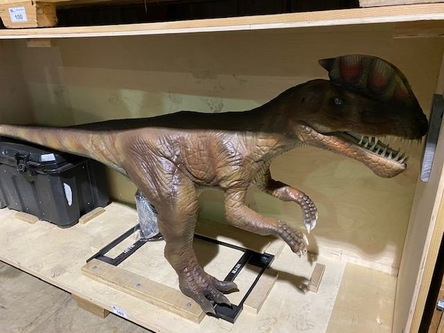 ANIMATRONIC DILOPHOSAURUS EARLY JURASSIC PERIOD DINOSAUR IN TRANSPORT CRATE LIVED IN NORTH AMERICA 193 MILLION YEARS AGO MEASURES 120" LONG X 36" WIDE X 59" TALL. APPROX. WEIGHT 325 KG. READY FOR SHIPPING, C/W CUSTOM CONTROLLER, SPEAKER, MOTION SENSOR, & ALL REQUIRED WIRING APPROX 716LBS