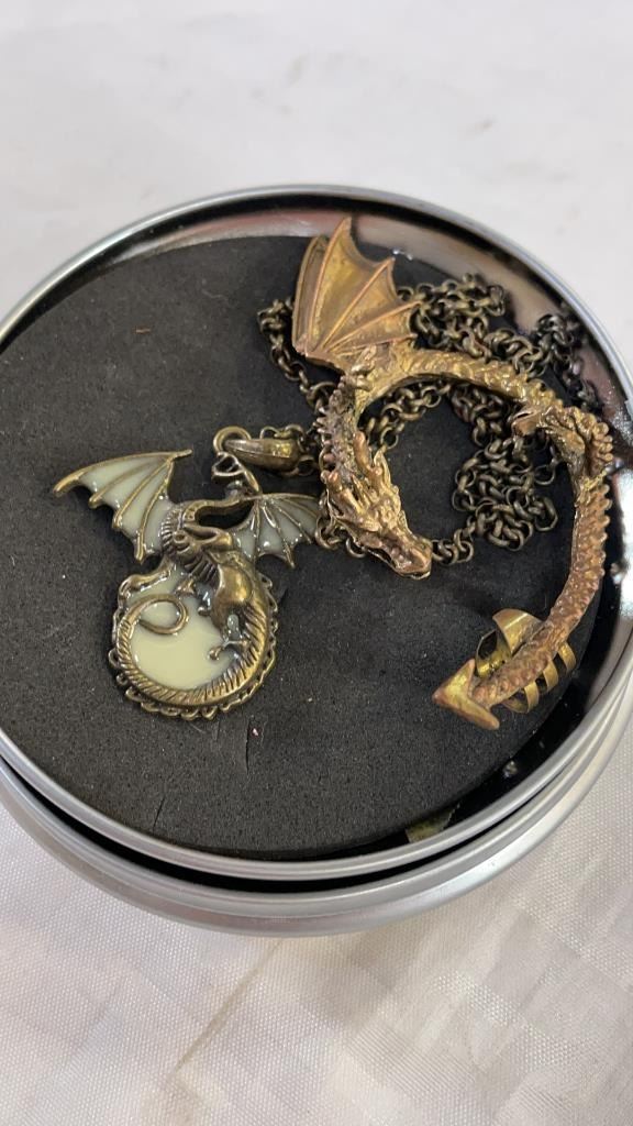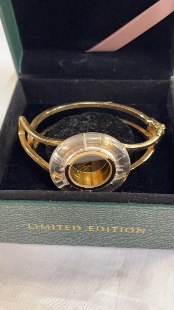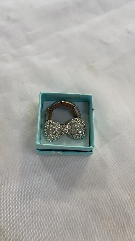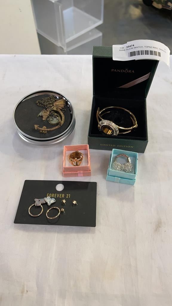 ANNE KLEIN WATCH, TOPAZ RING, DRAGON NECKLACE AND EAR CUFF, BOW RING AND EARRINGS