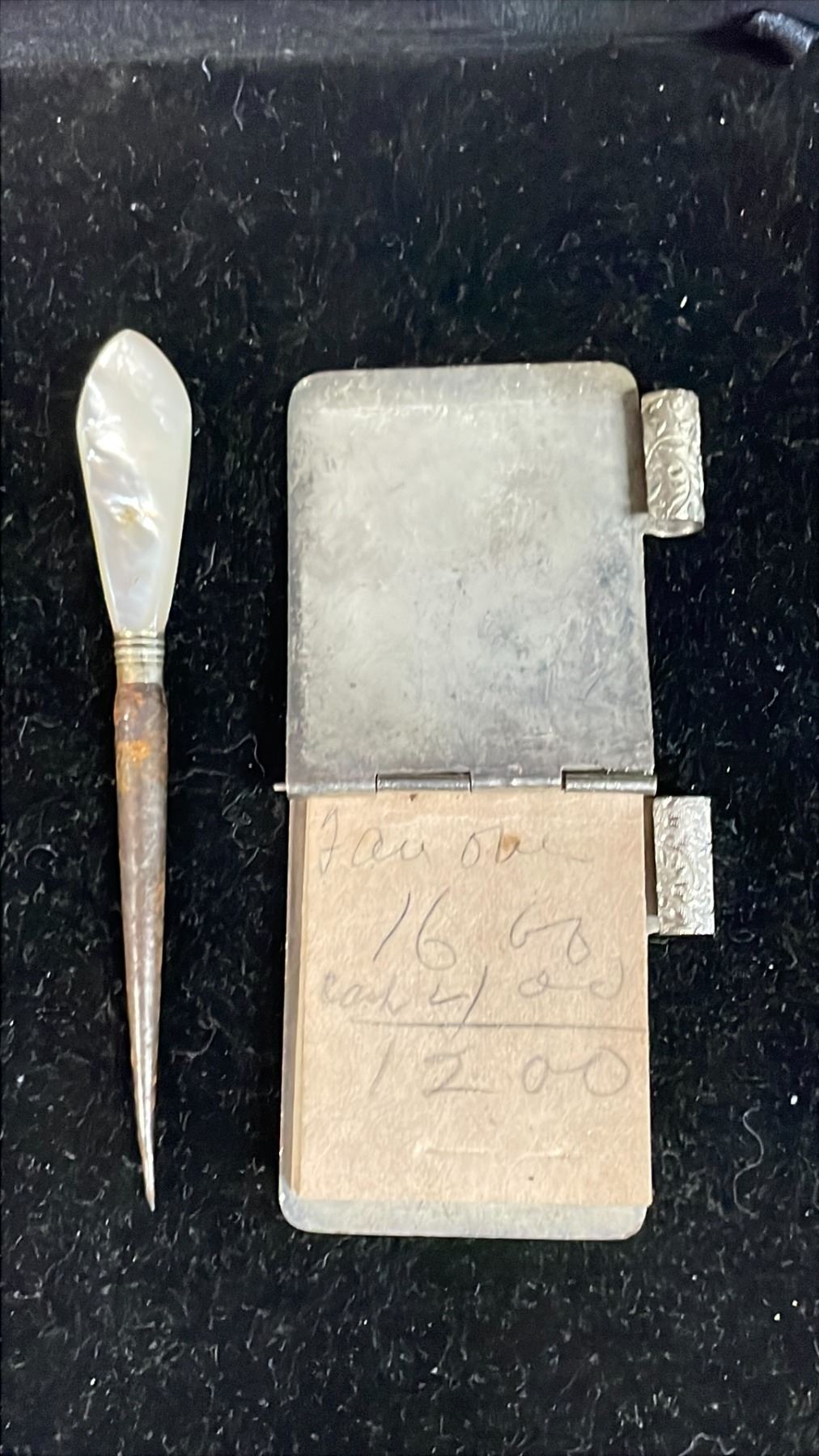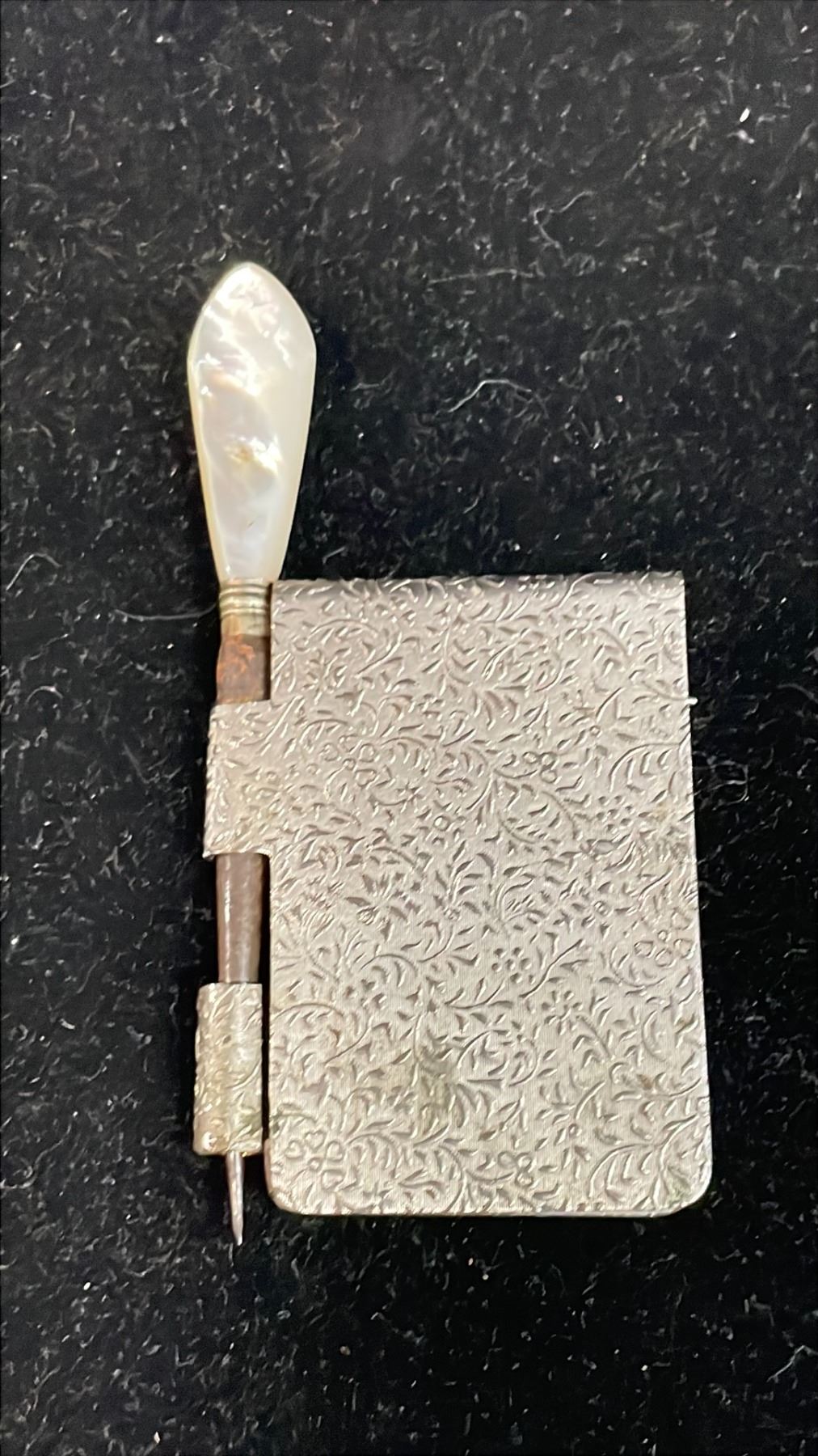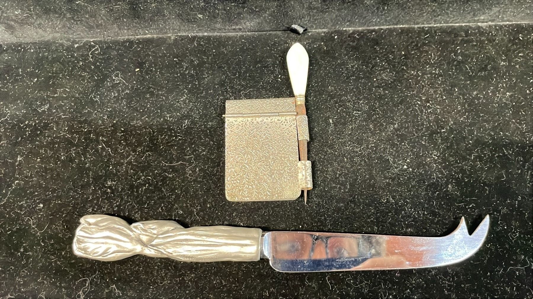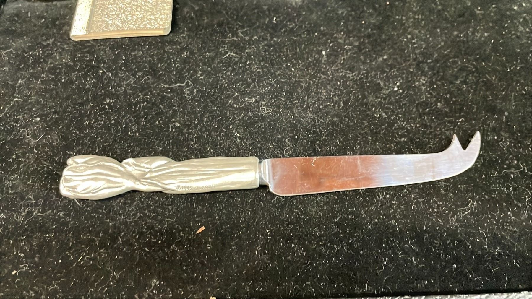 ANTIQUE 1920'S MOTHER OF PEARL SEWING HANDLE & 1992 SEAGULL STAINLESS STEEL CHEESE KNIFE WITH PEWTER HANDLE