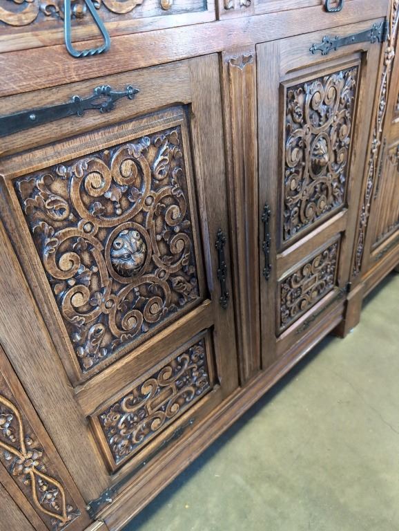 ANTIQUE 2PC SERVING CABINET, HIGHLY CARVED AND DETAILED WITH METAL HARDWARE, 7FT WIDE, 6FT TALL