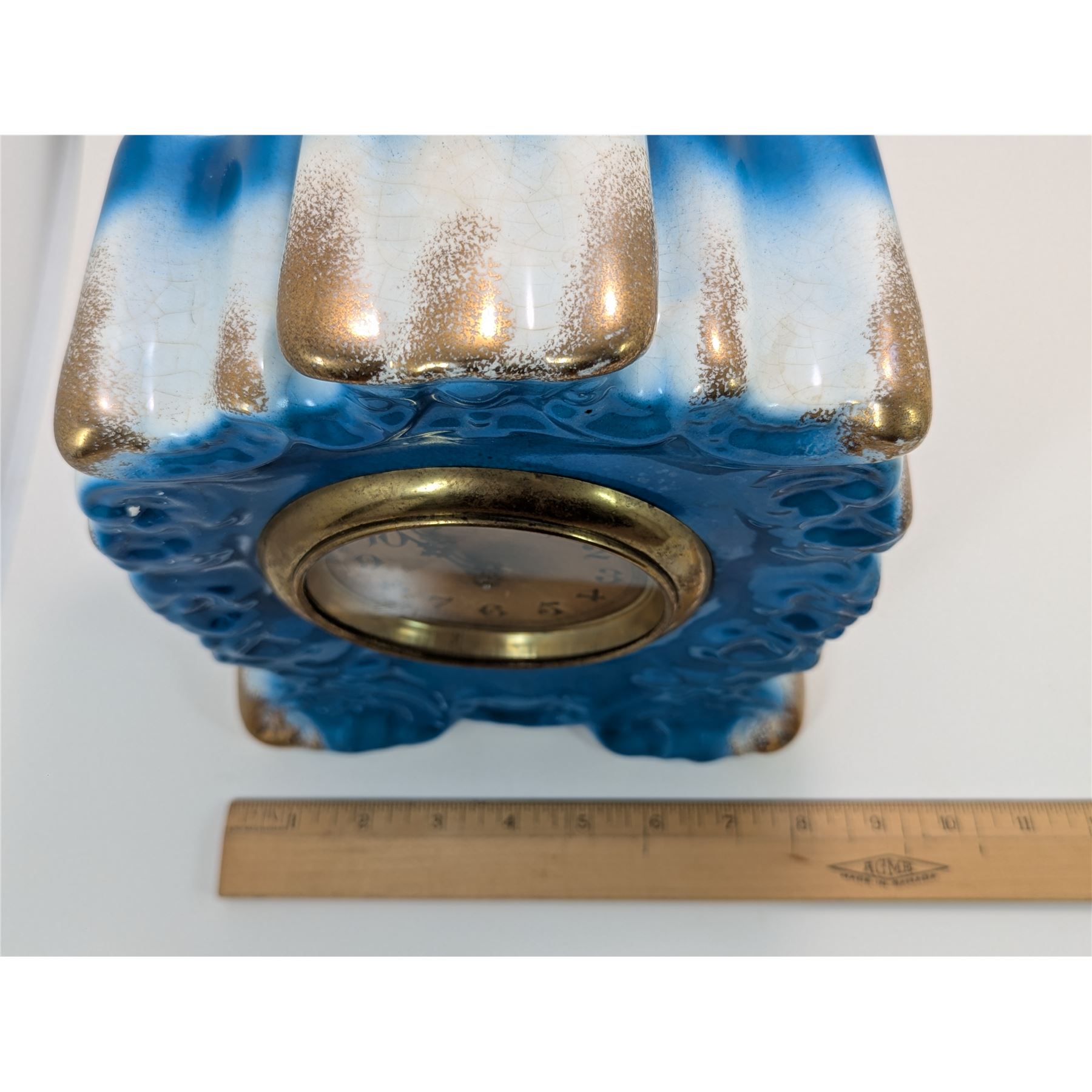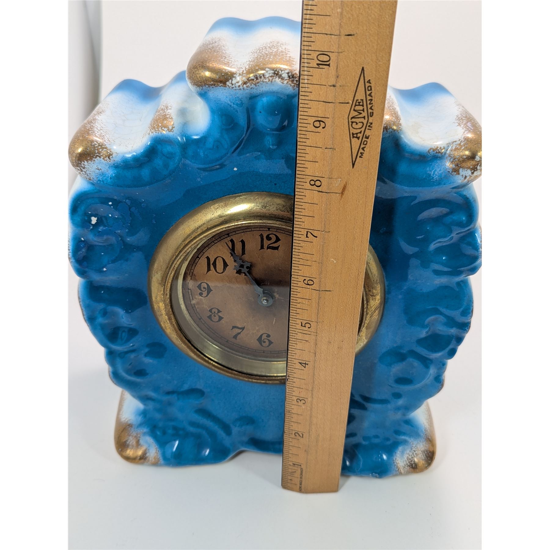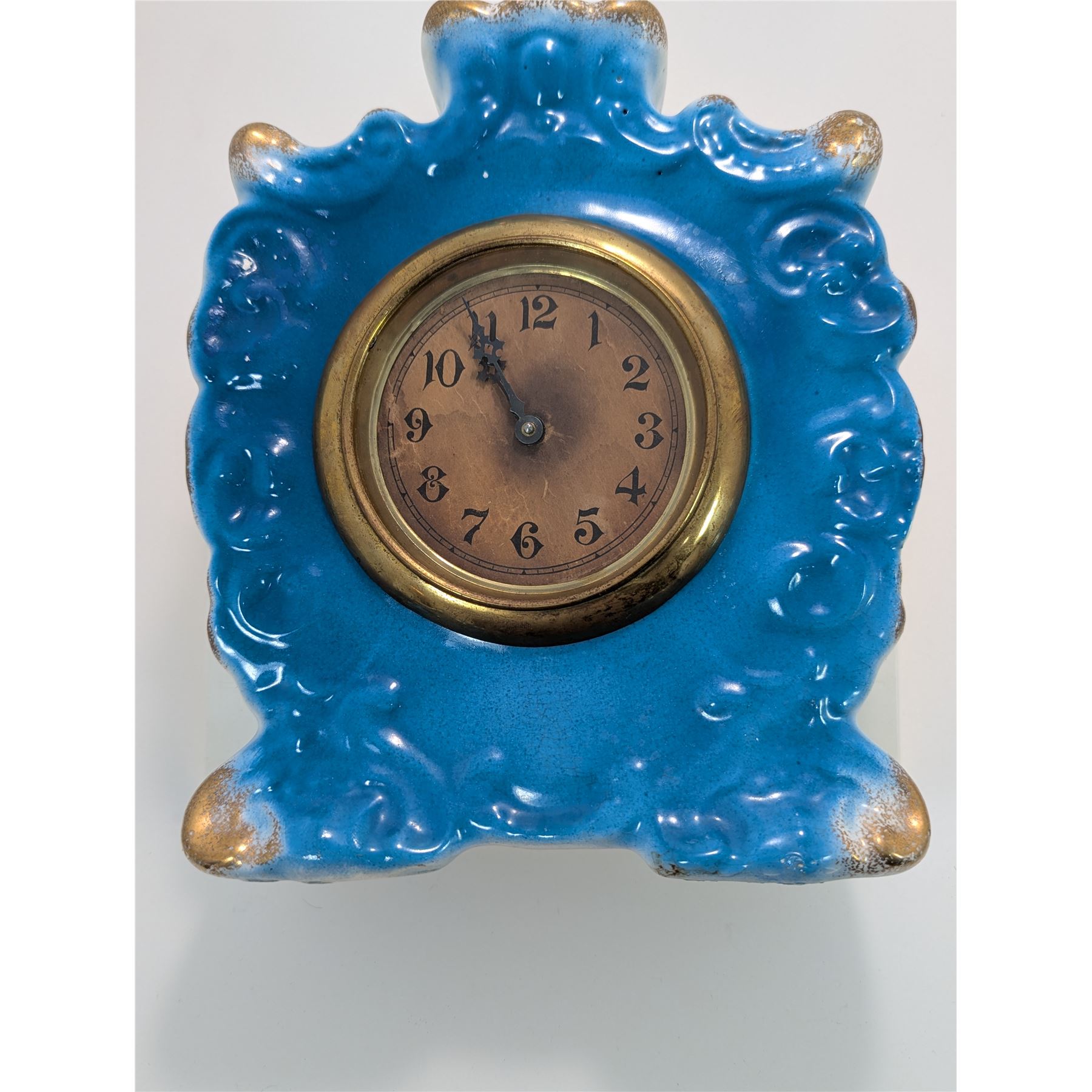 The clock features a vibrant blue ceramic case with gilded accents.