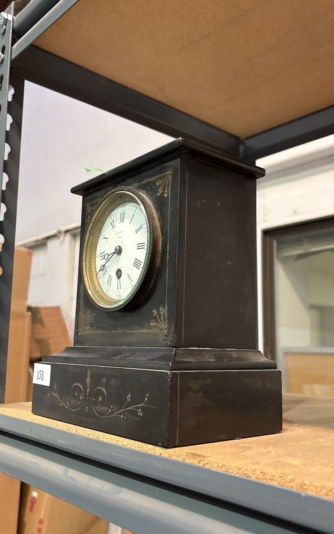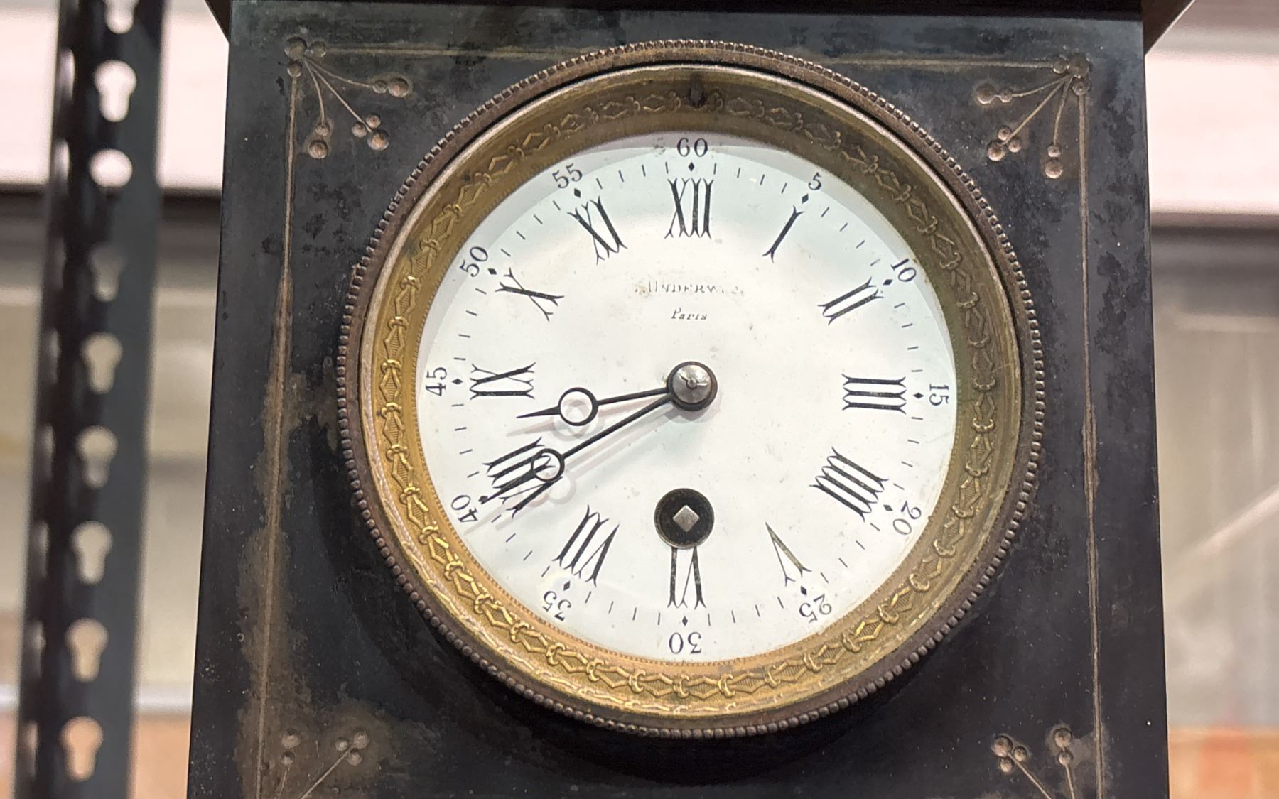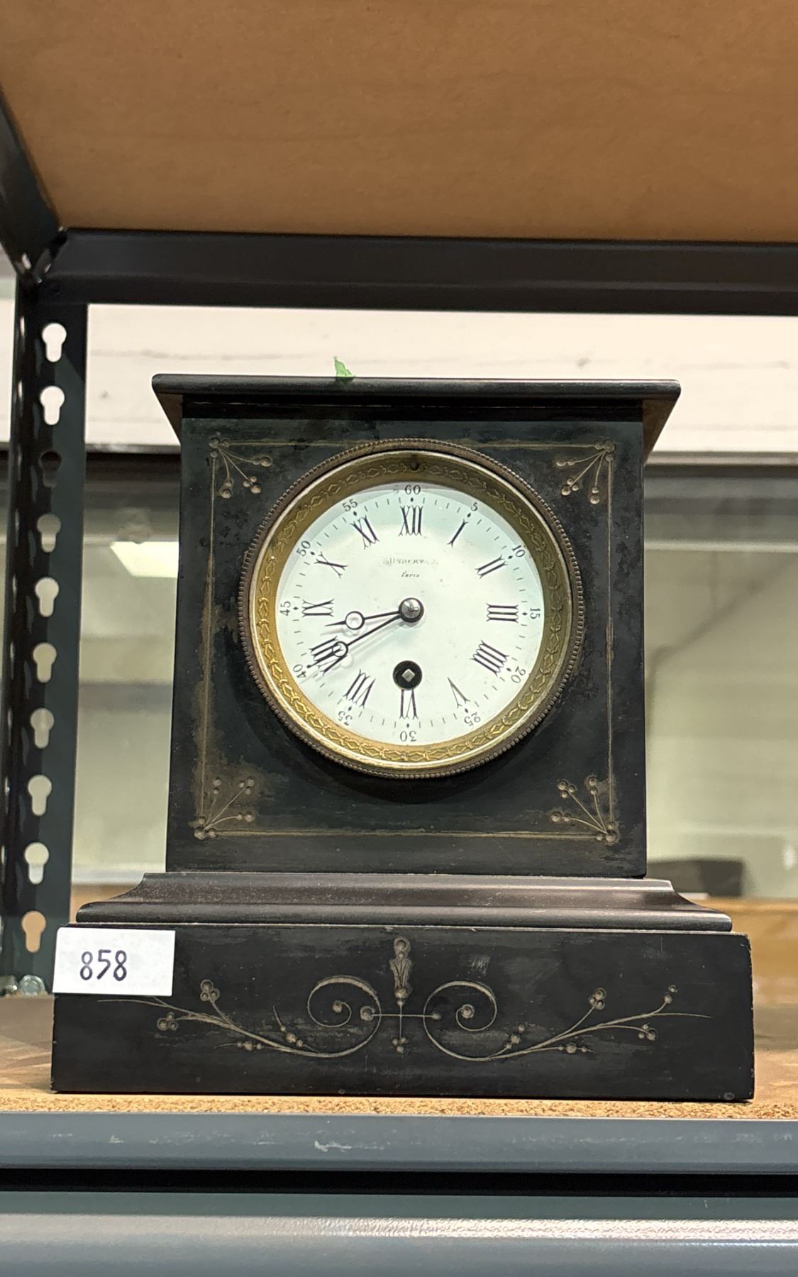 ANTIQUE BLACK MARBLE MANTLE CLOCK WITH KEY MADE IN PARIS