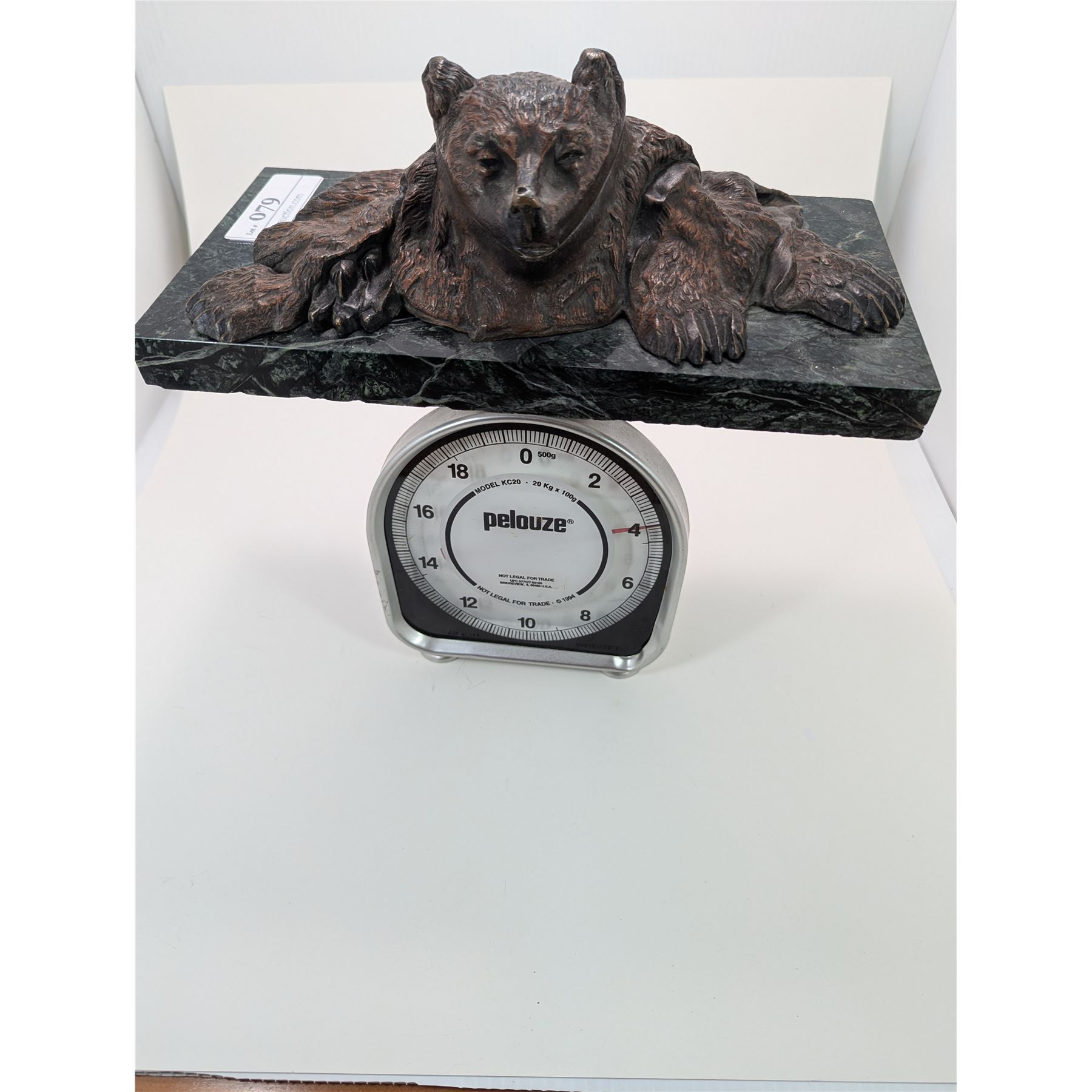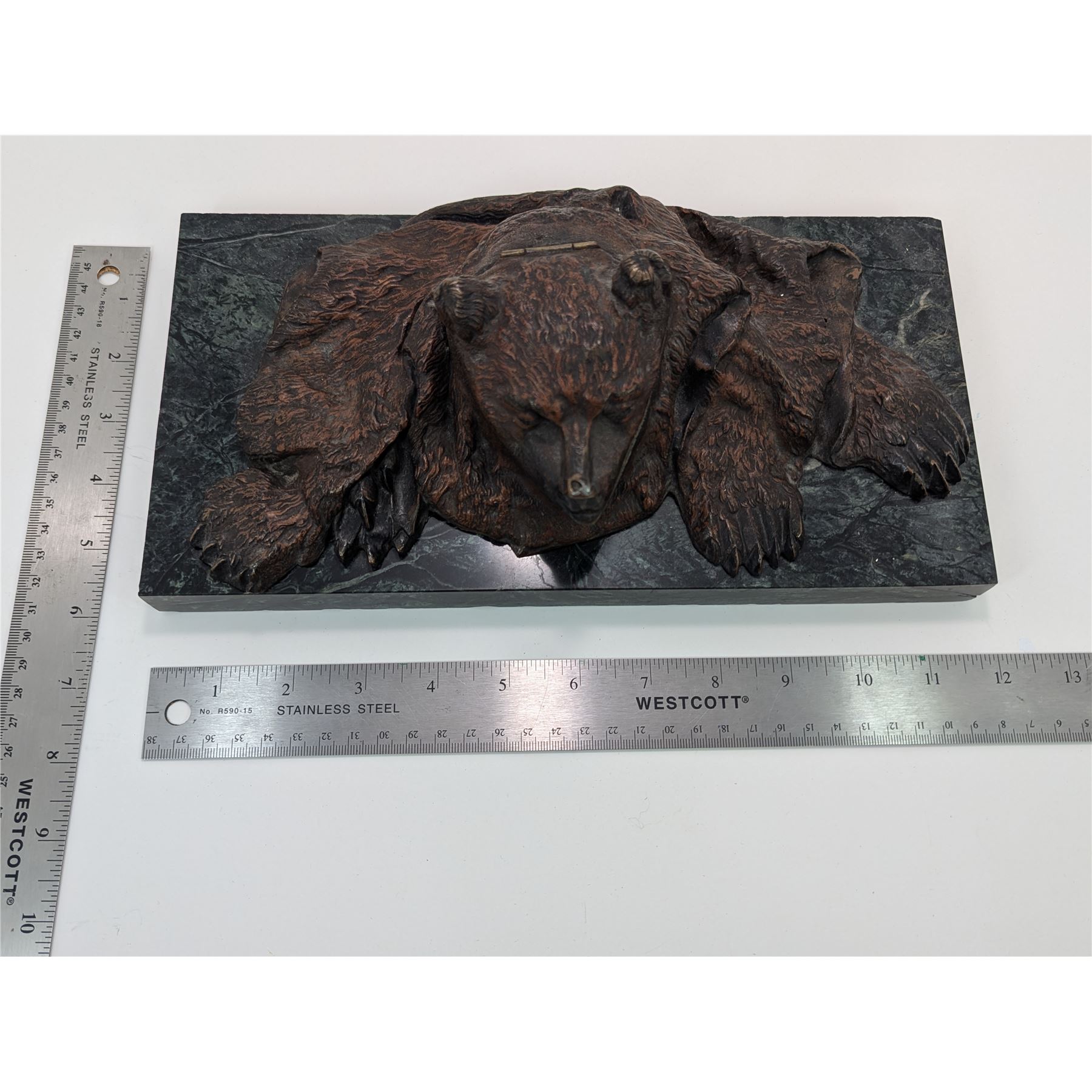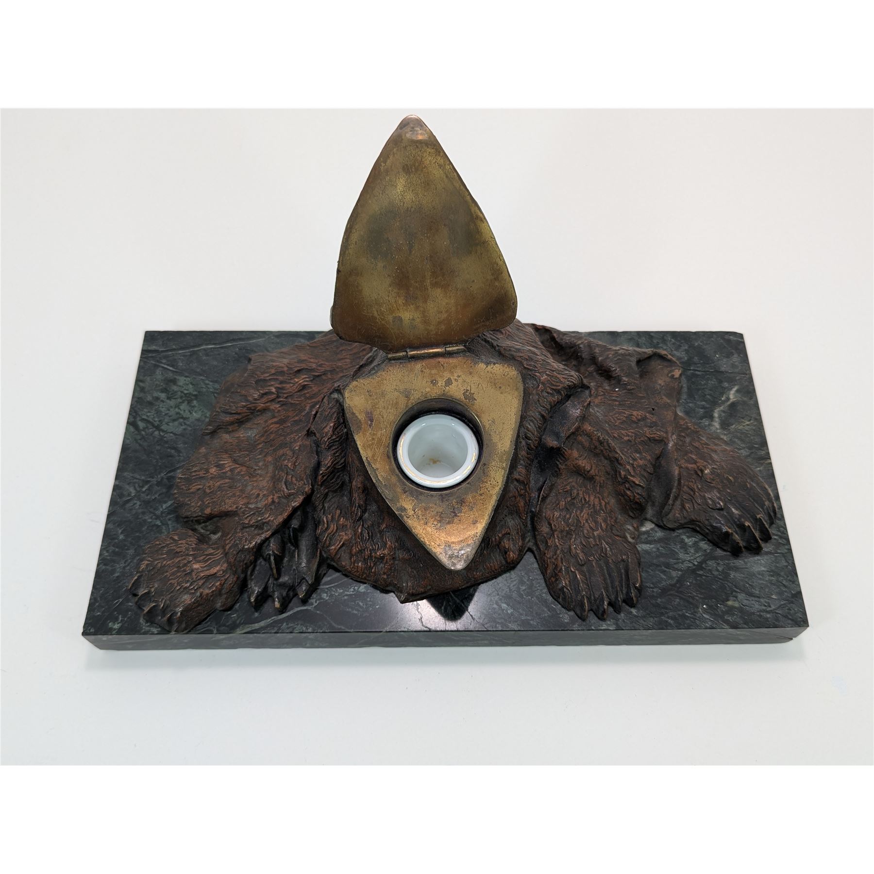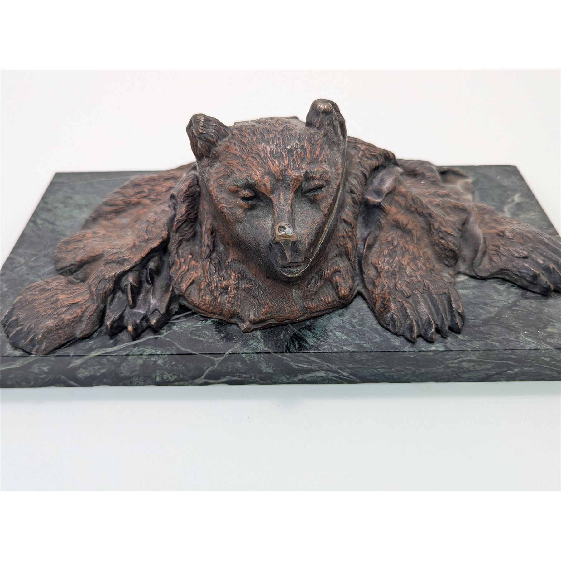 Antique bronze sculpture of a bear lying on a green marble base. The sculpture is sometimes referred to as a "Russian bronze bear" or a "resting bear". This is a desk ink well.