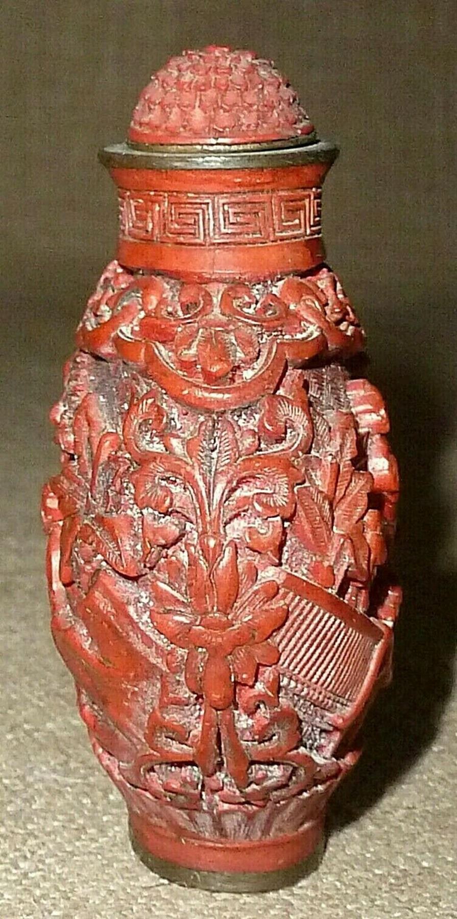 hand carved antique Cinnabar Chinese snuff bottle features engraved, detailed gardens, pagodas, trees, shrubbery, birds, and one spectacularly embossed and engraved courtesan on each side—each is different from the other. Features an equally ornate cap, with a carved wooden snuff spoon. Signed on the bottom. Beautifully done, this is one of the most elegant of snuff bottles. A remarkable piece! sIZE - 2 3/4" tall x 2" wide x 1 1/8" deep....
