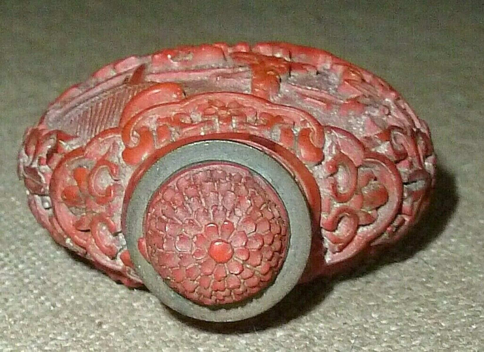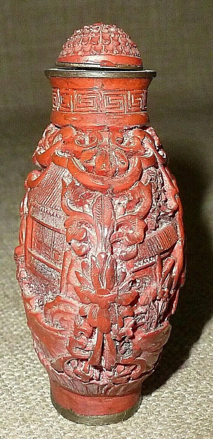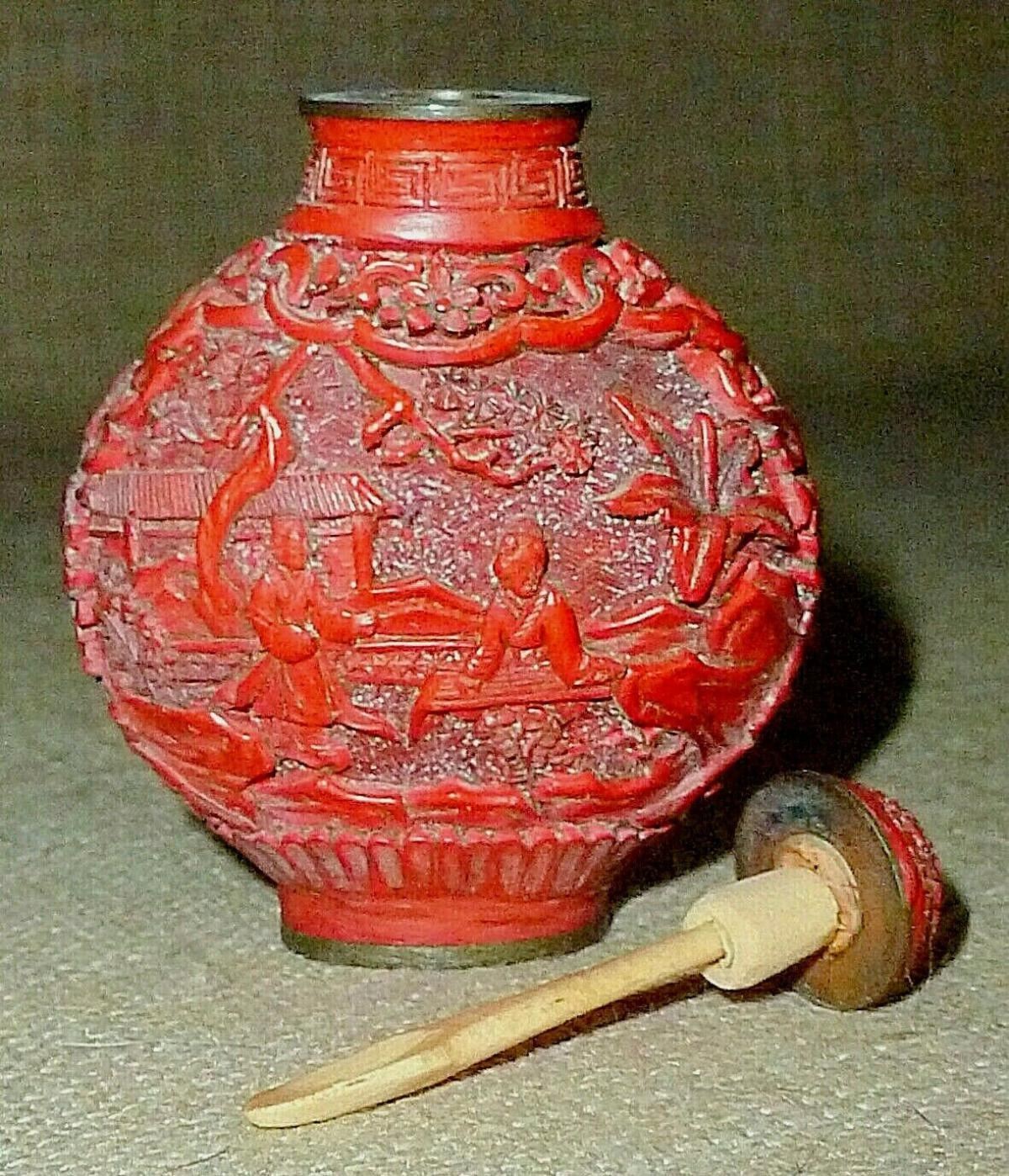 hand carved antique Cinnabar Chinese snuff bottle features engraved, detailed gardens, pagodas, trees, shrubbery, birds, and one spectacularly embossed and engraved courtesan on each side—each is different from the other. Features an equally ornate cap, with a carved wooden snuff spoon. Signed on the bottom. Beautifully done, this is one of the most elegant of snuff bottles. A remarkable piece! sIZE - 2 3/4" tall x 2" wide x 1 1/8" deep....