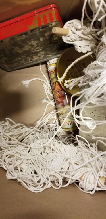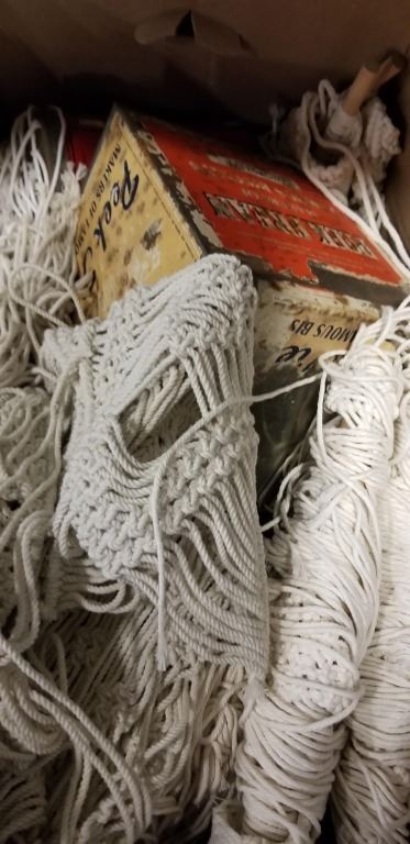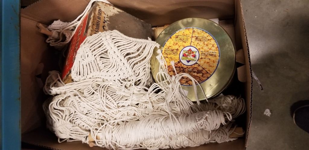 ANTIQUE COLLECTIBLE TINS, MACRAME ITEMS ETC