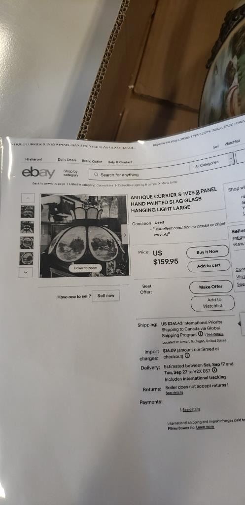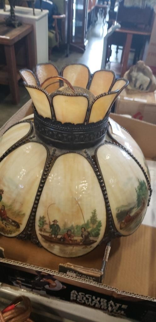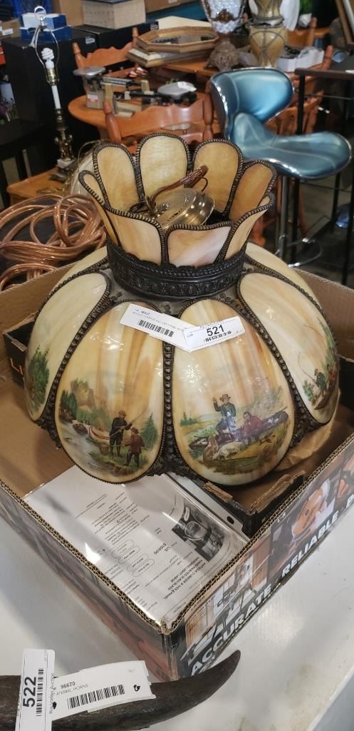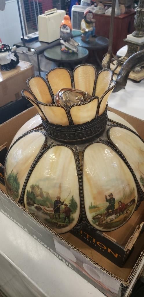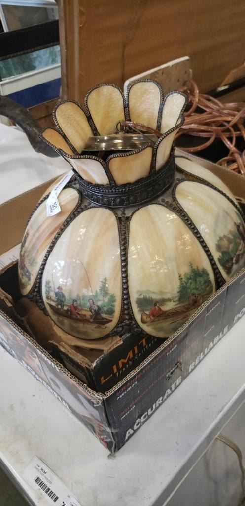 ANTIQUE CURRIER AND IVES PANEL HAND PAINTED SLAG GLASS HANGING LIGHT