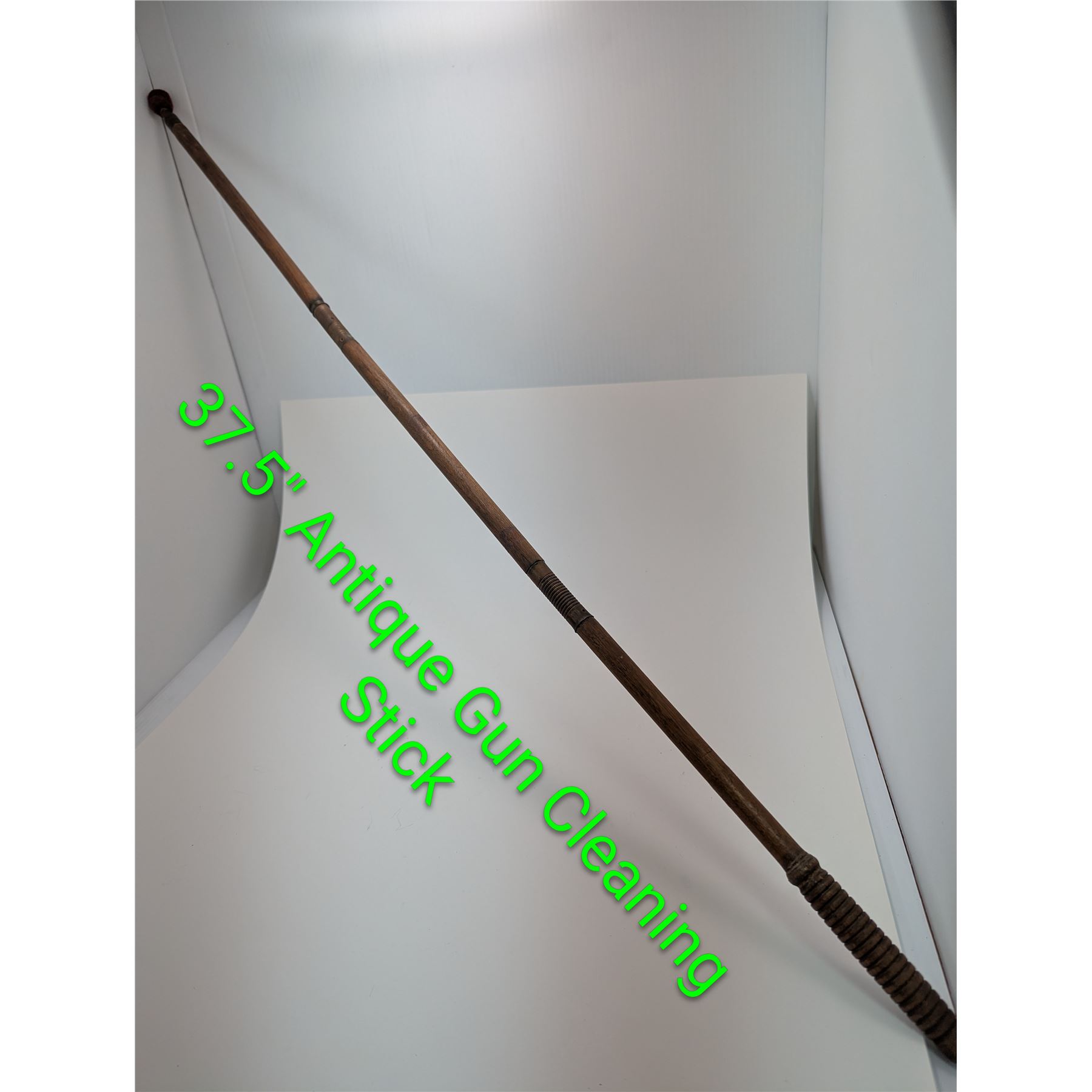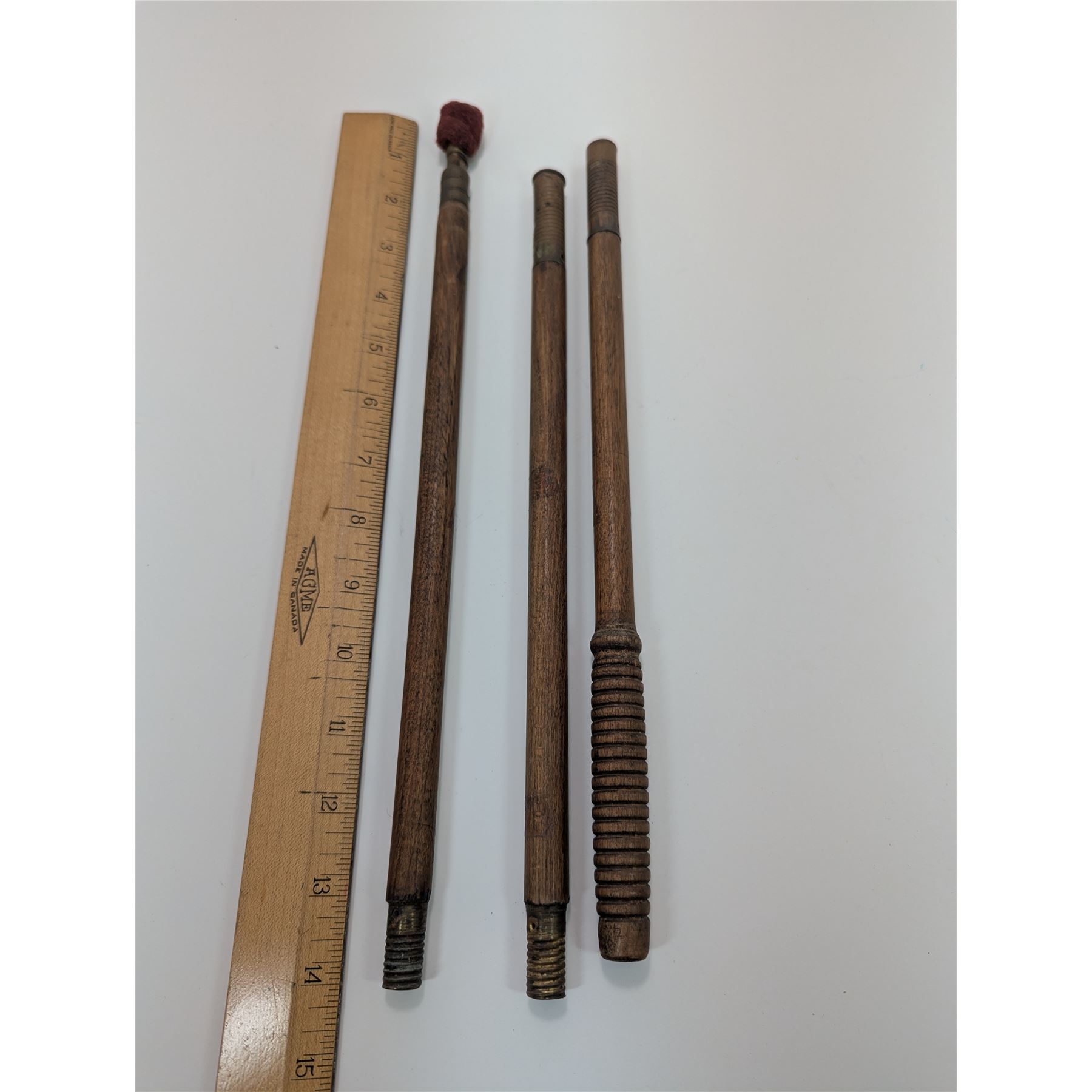 ANTIQUE GUN CLEANING STICK breaks down into three pieces, with threaded brass fittings and red felt fob for barrel polishing. This oak stick is from the end of the 1800's.