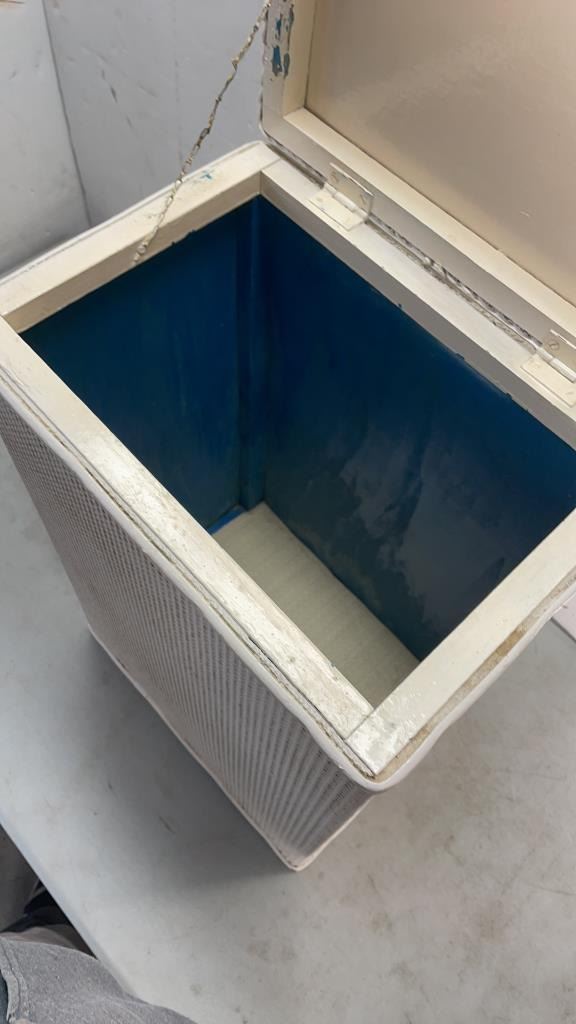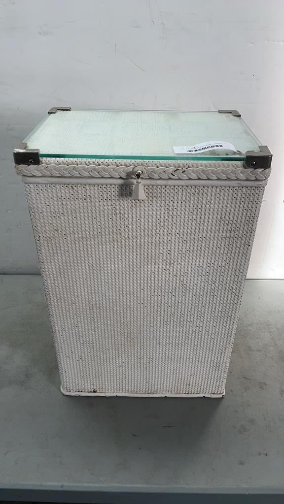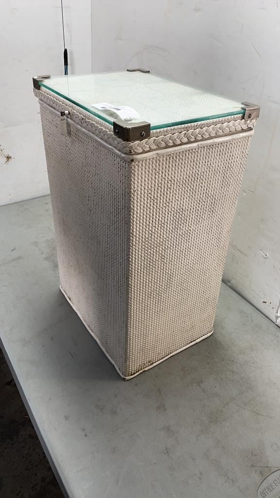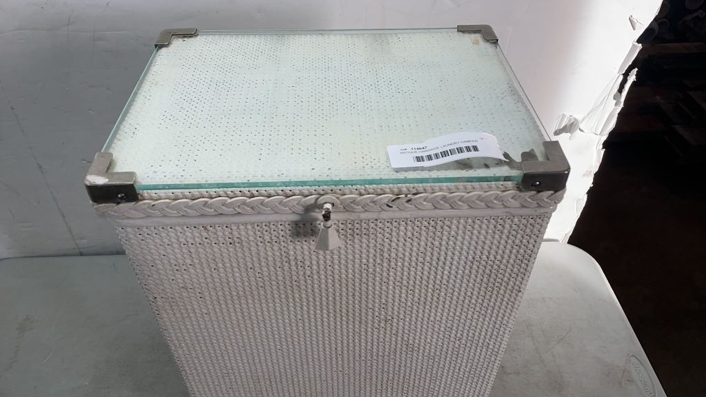 ANTIQUE HARDSIDE LAUNDRY HAMPER WITH GLASS TOP