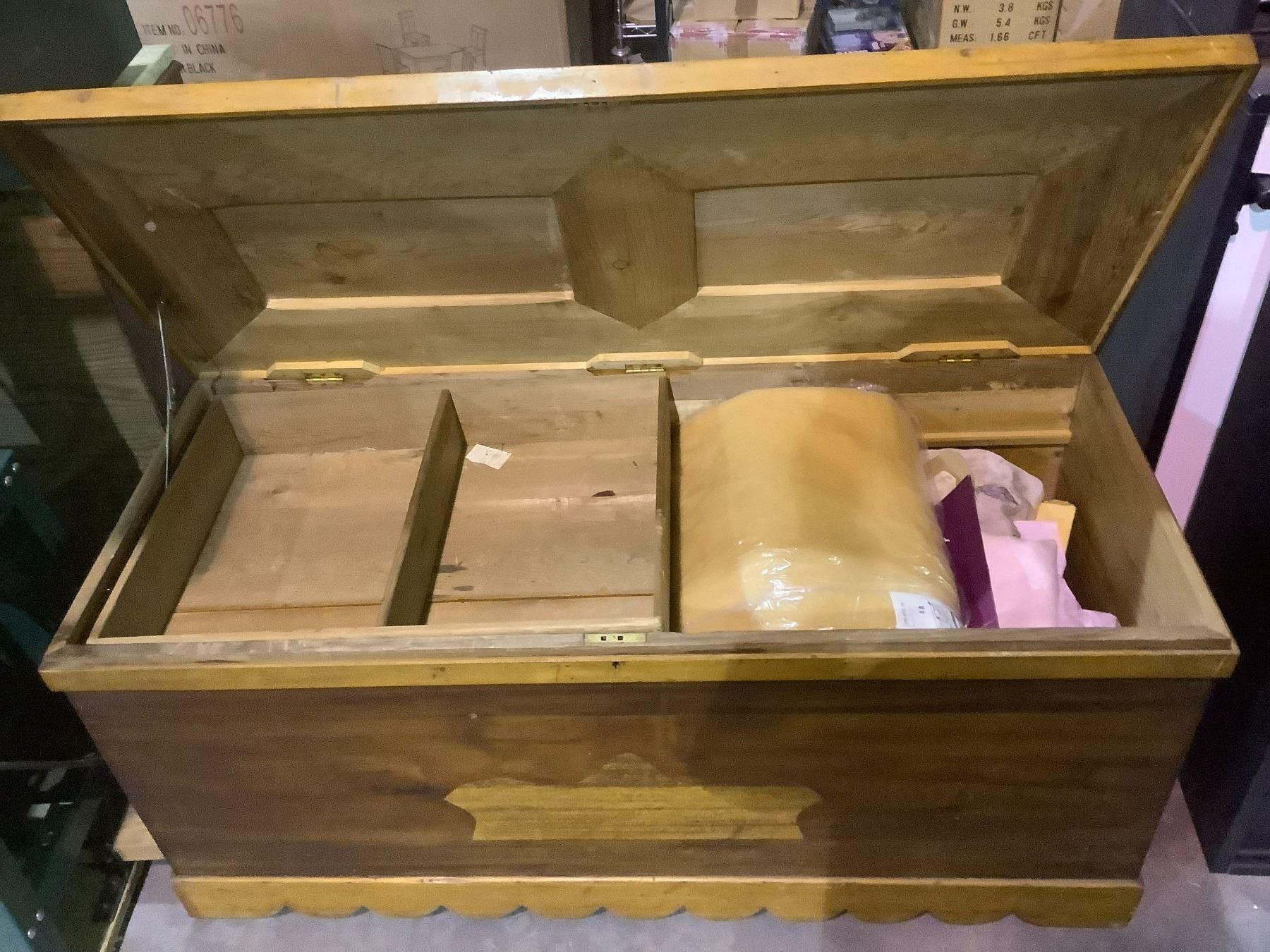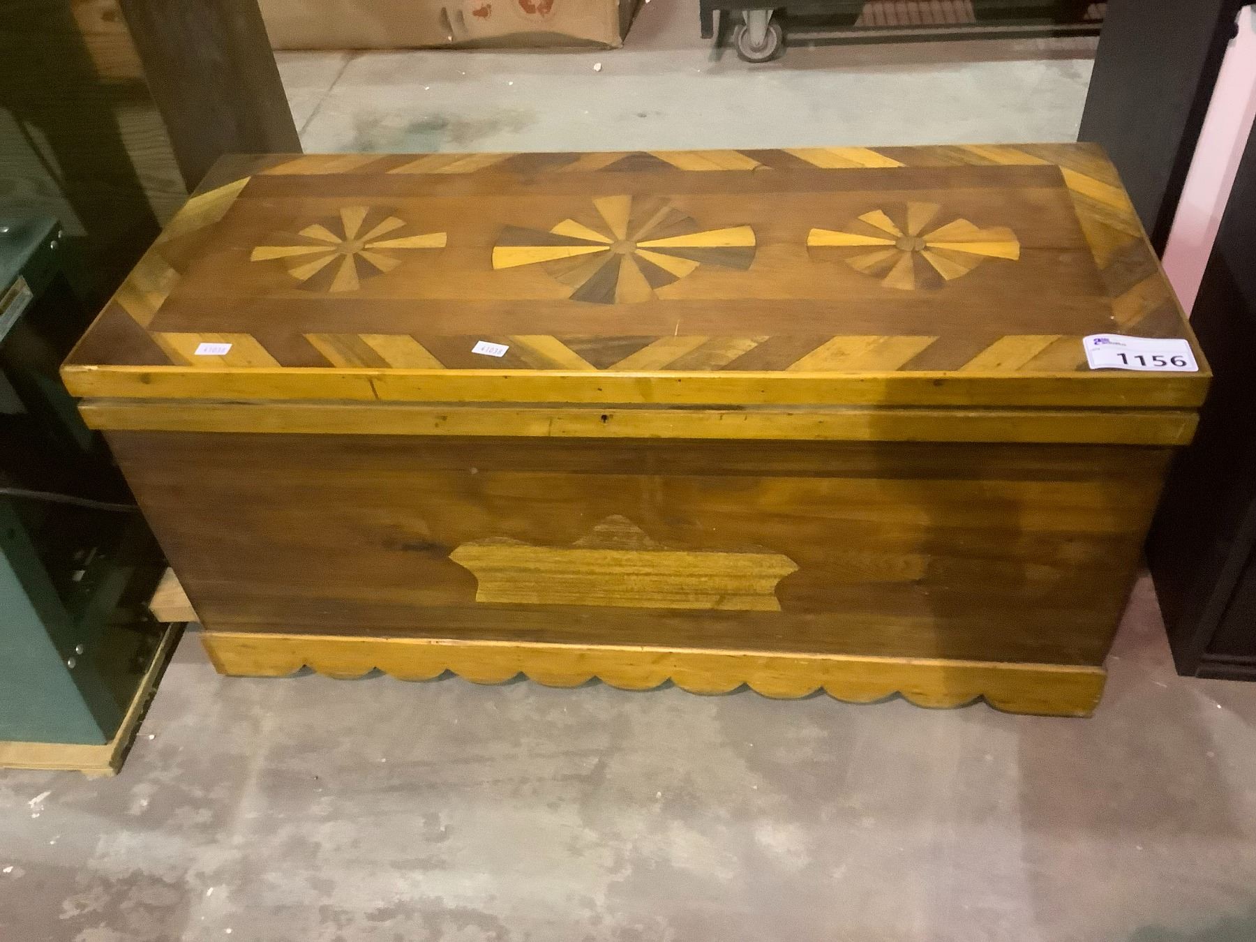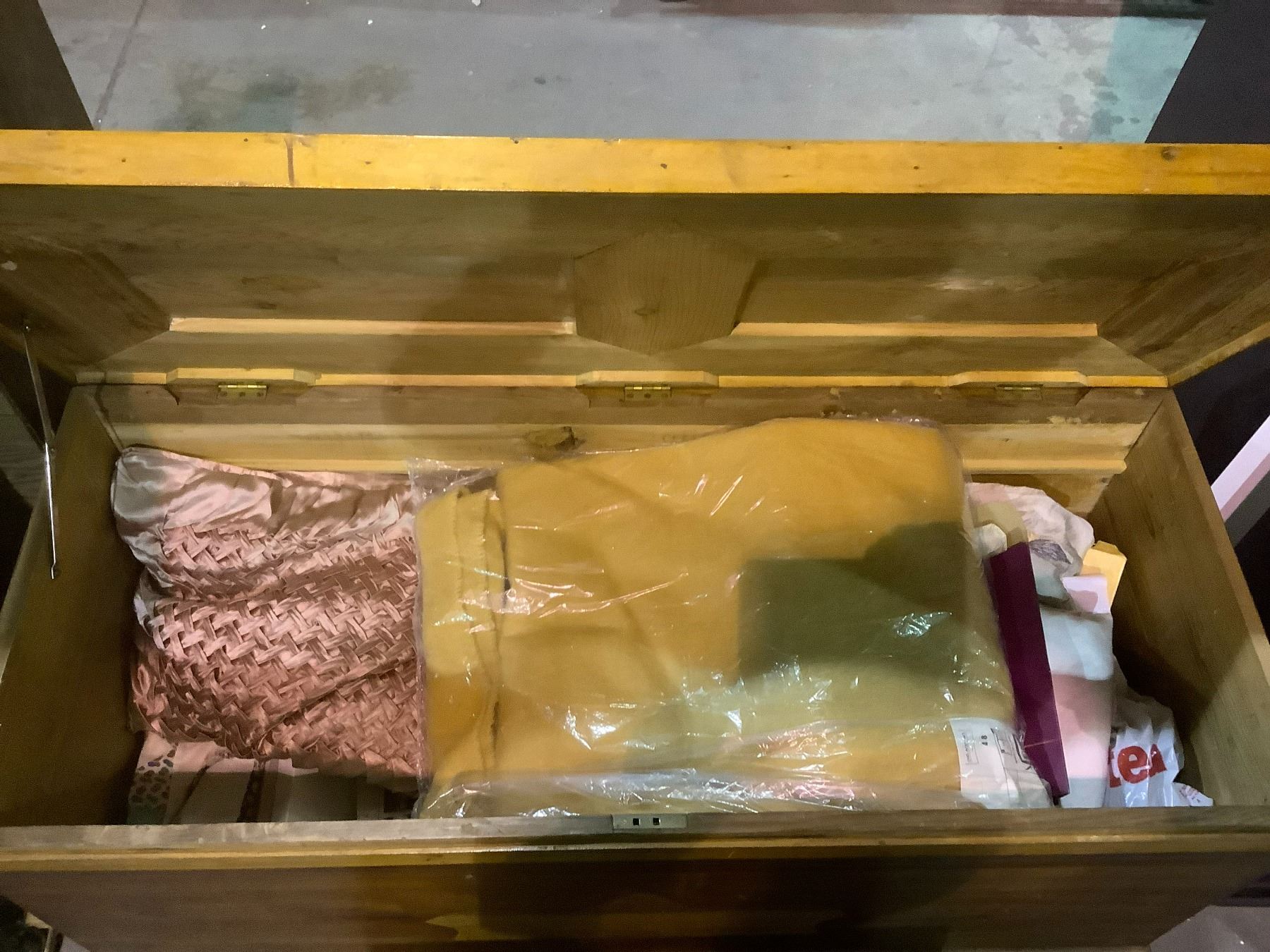 ANTIQUE INLAYED HOPE CHEST WITH ASSORTED BLANKETS AND OTHER CONTENTS