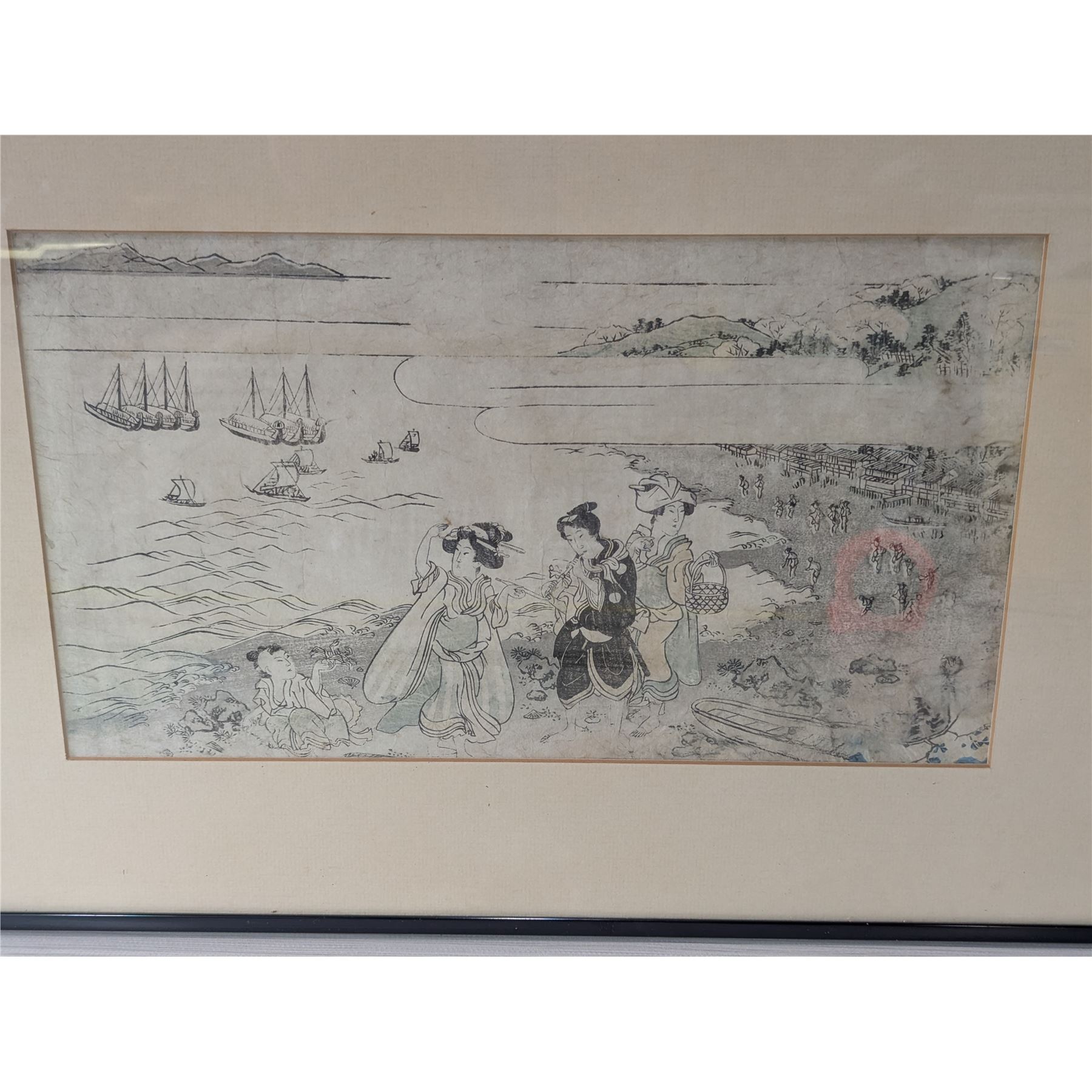 Type: Original Japanese woodblock print (Ukiyo-e style). Subject: Depicts a scene with figures (possibly women) on land near a body of water with boats.
