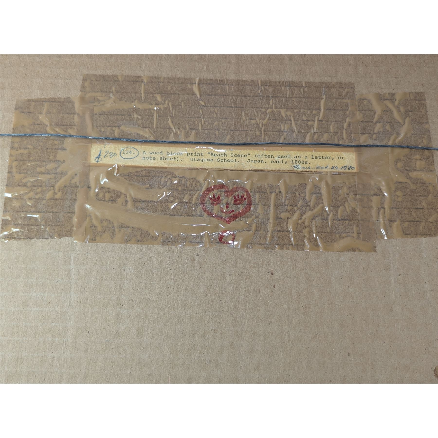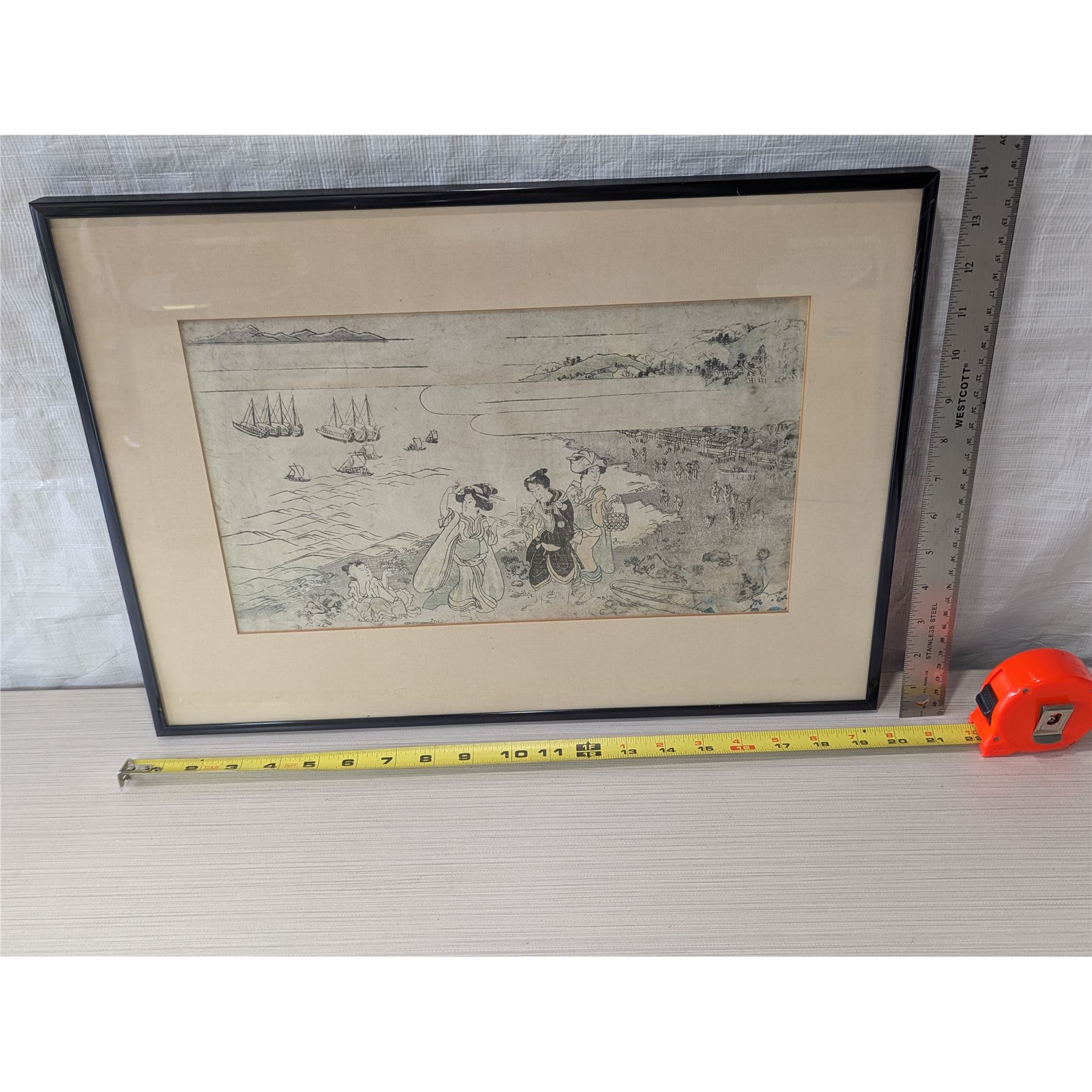 Antique Japanese woodblock print, possibly from the Edo period, depicting a scene with figures and boats. Measures 30" x 14".